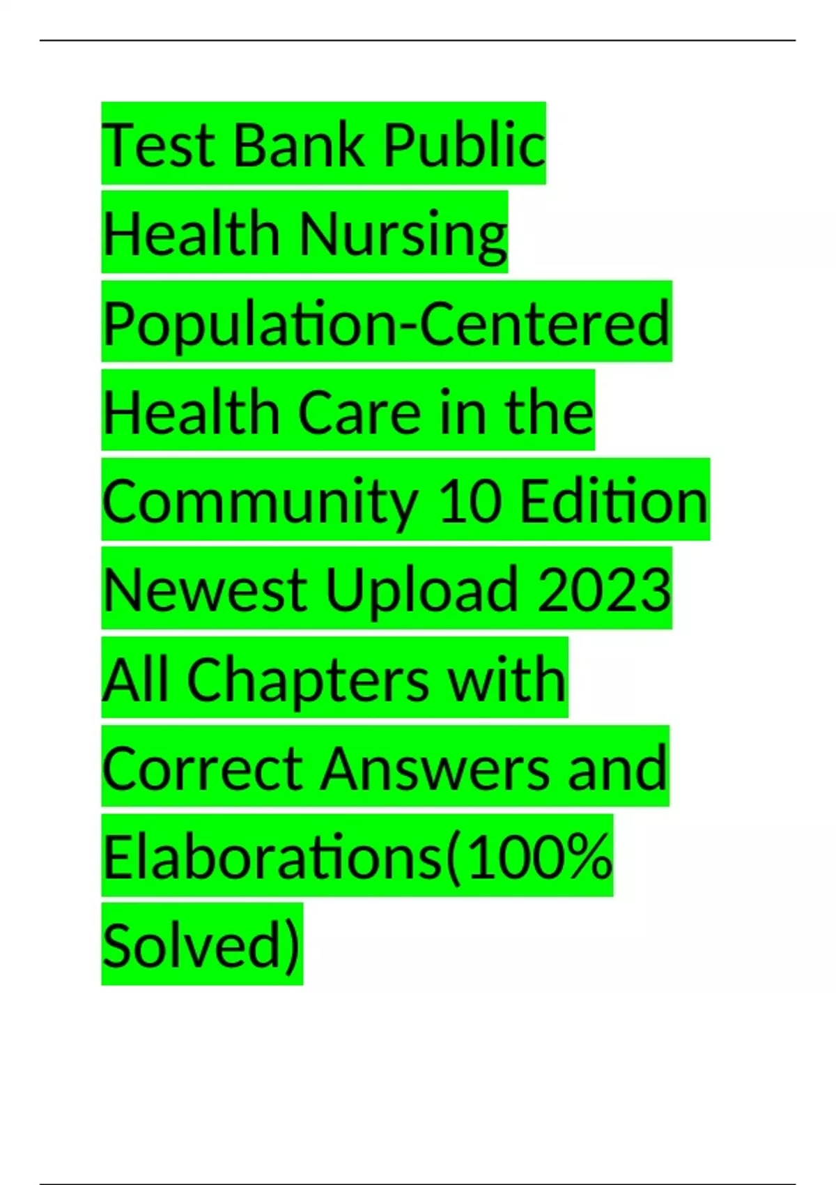Test Bank Public Health Nursing Population-Centered Health Care in the Community 10 Edition Newest Upload 2023 All Chapters with Correct Answers and Elaborations(100% Solved)