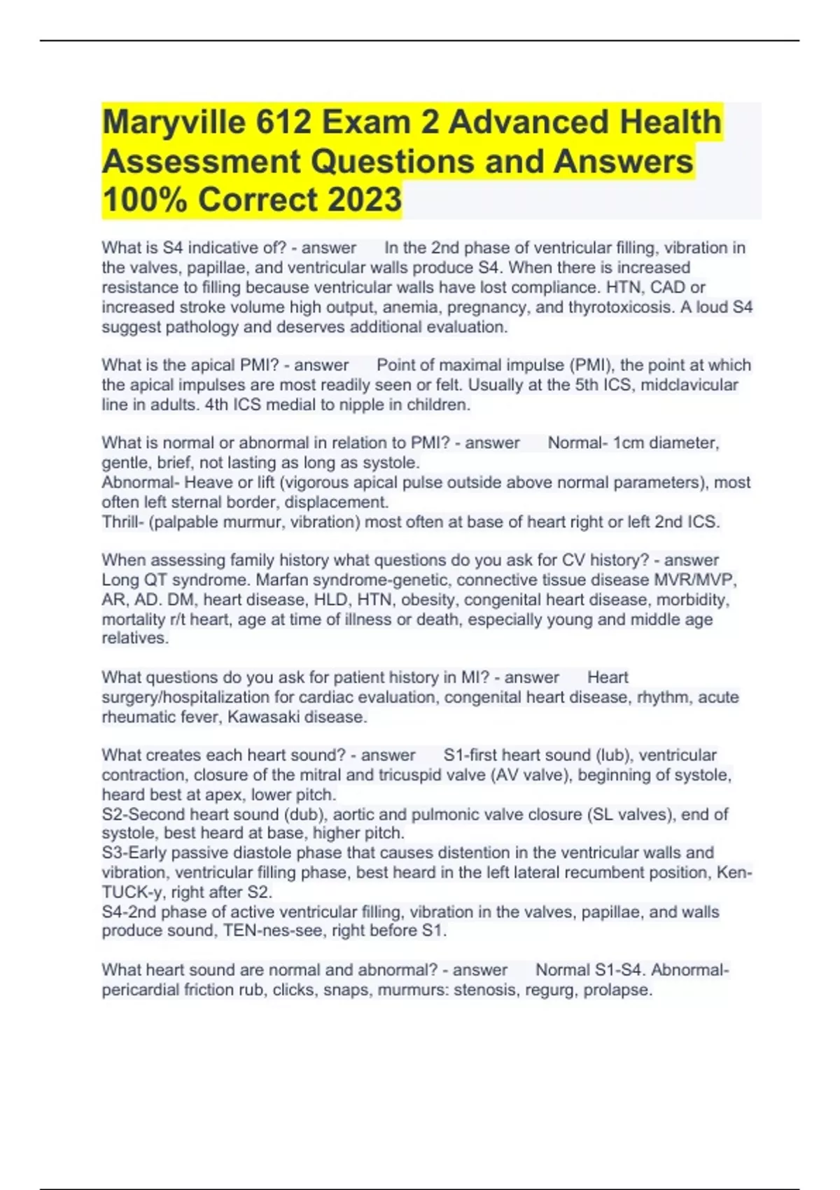 Maryville 612 Exam 2 Advanced Health Assessment Questions and Answers 100% Correct 2023 What is S4 indicative of? In the 2nd phase of ventricular filling, vibration in the valves, papillae, and ventricular walls produce S4. When there is increased resistance to filling because ventricular walls have lost compliance. HTN, CAD or increased stroke volume high output, anemia, pregnancy, and thyrotoxicosis. A loud S4 suggest pathology and deserves additional evaluation. What is the apical PMI? Point of maximal impulse (PMI), the point at which the apical impulses are most readily seen or felt. Usually at the 5th ICS, midclavicular line in adults. 4th ICS medial to nipple in children. What is normal or abnormal in relation to PMI? Normal- 1cm diameter, gentle, brief, not lasting as long as systole. Abnormal- Heave or lift (vigorous apical pulse outside above normal parameters), most often left sternal border, displacement. Thrill- (palpable murmur, vibration) most often at base of heart right or left 2nd ICS. When assessing family history what questions do you ask for CV history? Long QT syndrome. Marfan syndrome-genetic, connective tissue disease MVR/MVP, AR, AD. DM, heart disease, HLD, HTN, obesity, congenital heart disease, morbidity, mortality r/t heart, age at time of illness or death, especially young and middle age relatives. What questions do you ask for patient history in MI? Heart surgery/hospitalization for cardiac evaluation, congenital heart disease, rhythm, acute rheumatic fever, Kawasaki disease. What creates each heart sound? S1-first heart sound (lub), ventricular contraction, closure of the mitral and tricuspid valve (AV valve), beginning of systole, heard best at apex, lower pitch. S2-Second heart sound (dub), aortic and pulmonic valve closure (SL valves), end of systole, best heard at base, higher pitch. S3-Early passive diastole phase that causes distention in the ventricular walls and vibration, ventricular filling phase, best heard in the left lateral recumbent position, Ken-TUCK-y, right after S2. S4-2nd phase of active ventricular filling, vibration in the valves, papillae, and walls produce sound, TEN-nes-see, right before S1. What heart sound are normal and abnormal? Normal S1-S4. Abnormal- pericardial friction rub, clicks, snaps, murmurs: stenosis, regurg, prolapse. What is the correct documentation of abnormal heart sounds? Timing and duration systolic, diastolic, holostystolic, holodiastolic, early late phases, continuous. Pitch (high, med, low). Intensity (grade 1-7). Pattern: crescendo, decrescendo, square or plateau. Quality- harsh, raspy, machine like, vibration, musical, blowing. Location-landmarks, ICS, sternal border, apex, base. Radiation-landmarks, axilla, carotid. Respiratory phase-intensity, quality, and timing. How do you document bounding arterial pulses? Pulse amplitude on a scale from 0-4. 0- Absent, not palpable 1- Diminished, barely palpable 2- Expected 3- Full, increased 4- Bounding, aneurysmal What arterial pulse best assess heart rate? Palpate the arterial pulses (most often radial) to assess the heart rate and rhythm. Infants the brachial, radial, and femoral pulses are easily palpated. What are the steps to a carotid artery exam? Place the bell of the stethoscope over the artery. When listening to the carotid artery, ask the patient to suspend his/her breath for a few heartbeats so that respiratory sounds will not interfere with auscultation. You should hear venous hums and carotid bruits. In a carotid exam what do you do or not do? Do not palpate both sides simultaneously. This can cause a drop in heart rate and blood pressure resulting in a syncope and decreasing blood flow to the brain. Why assess JVD? The activity of the right side of the heart is transmitted back through the jugular veins. What position should the pt. be in to assess JVD, what is abnormal? The patient should be in a supine position using a bed or exam table with an adjustable back. Use a light to illuminate the side of the neck that is being examined. What are the causes of murmurs? Murmurs are caused by some disruption in the flow of blood into, through, or out of the heart. Common causes are diseased valves (stenosis or regurg). Valve insufficiency produce what type of murmur? Regurgitation Describe murmurs? Heart murmurs are relatively prolonged extra sounds heard during systole and diastole. Murmurs are caused by some disruption in the flow of blood into, through, or out of the heart. Stage murmurs for documentation Timing, duration, pitch, intensity, pattern, quality, location, radiation, and respiratory phases. What stethoscope placement is best for heart sounds? 5 Cardiac area Aortic valve area: 2nd right ICS at the right sternal border Pulmonic valve area: 2nd left ICS at the left sternal border 2nd pulmonic area (Erbs point): 3rd left ICS at the left sternal border, S2 is heard best here Tricuspid area: 4th left ICS along the lower left sternal border Mitral area: apex of the heart in the 5th left ICS at the MCL.
