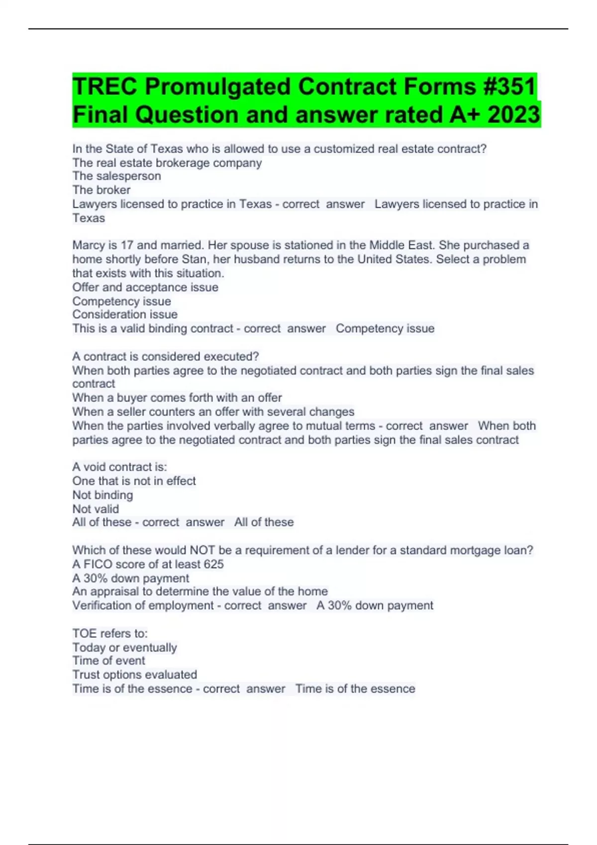 TREC Promulgated Contract Forms #351 Final Question and answer rated A+ 2023In the State of Texas who is allowed to use a customized real estate contract? The real estate brokerage company The salesperson The broker Lawyers licensed to practice in Texas Lawyers licensed to practice in Texas Marcy is 17 and married. Her spouse is stationed in the Middle East. She purchased a home shortly before Stan, her husband returns to the United States. Select a problem that exists with this situation. Offer and acceptance issue Competency issue Consideration issue This is a valid binding contract Competency issue A contract is considered executed? When both parties agree to the negotiated contract and both parties sign the final sales contract When a buyer comes forth with an offer When a seller counters an offer with several changes When the parties involved verbally agree to mutual terms When both parties agree to the negotiated contract and both parties sign the final sales contract A void contract is: One that is not in effect Not binding Not valid All of these All of these Which of these would NOT be a requirement of a lender for a standard mortgage loan? A FICO score of at least 625 A 30% down payment An appraisal to determine the value of the home Verification of employment A 30% down payment TOE refers to: Today or eventually Time of event Trust options evaluated Time is of the essence Time is of the essence Inserting the phrase "this offer is subject to cancellation by the buyer at any time prior to acceptance" will show the seller all of the following except: Quick action is necessary The seller should make a decision The seller should accept or make a counter The buyer is not really interested his shows that the buyer is not only interested but they want a quick response from the seller. What would be an example of a good faith effort that the court would take into account and not penalize a party for failing to complete? The party deliberately failed to meet the requirements One party stopped answering their phone in efforts to stall proceedings The party in question went on an extended vacation A party suffered a serious heart attack and was in a coma for two weeks A party suffered a serious heart attack and was in a coma for two weeks