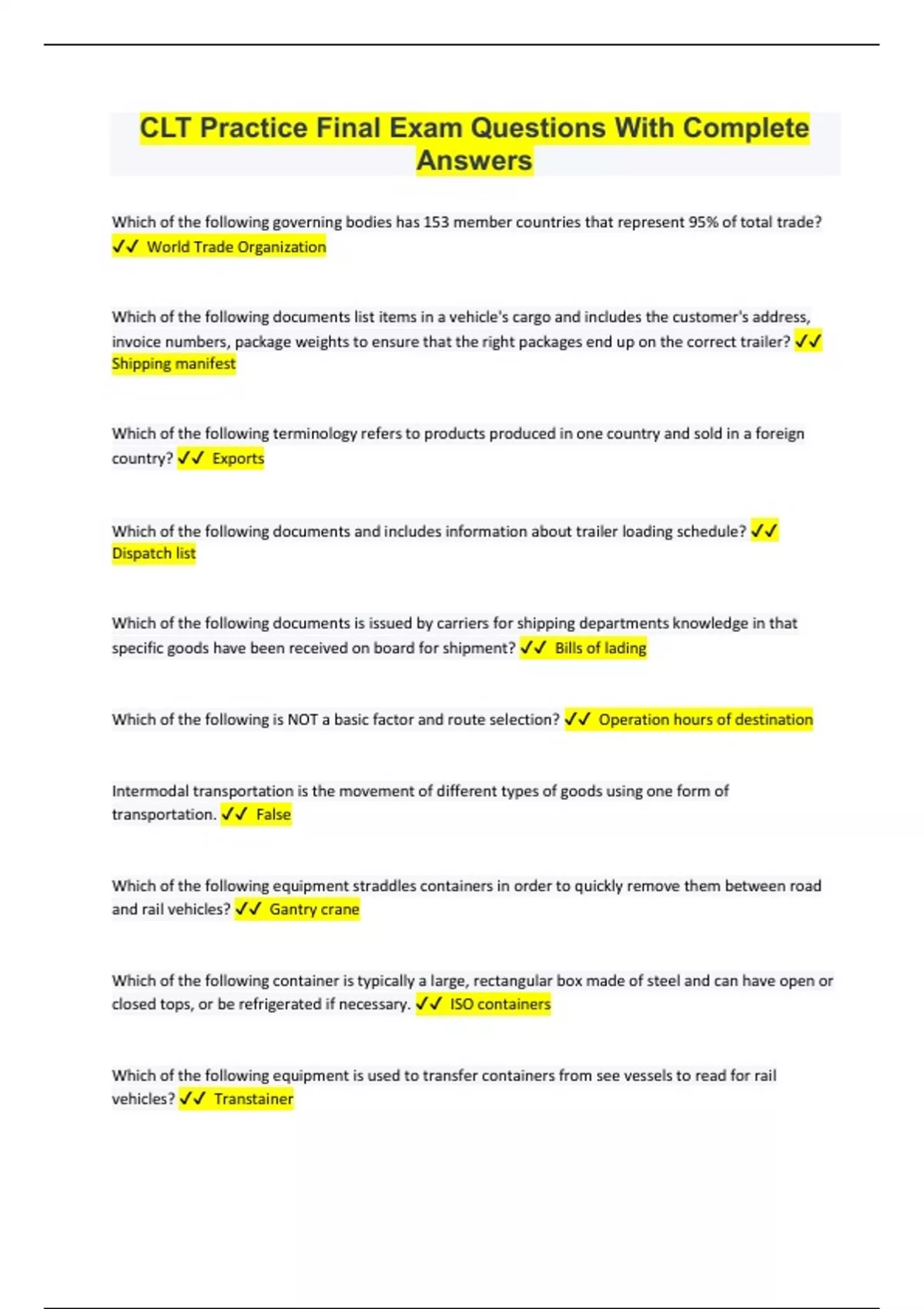 CLT Practice Final Exam Questions With Complete Answers Which of the following governing bodies has 153 member countries that represent 95% of total trade? World Trade Organization Which of the following documents list items in a vehicle's cargo and includes the customer's address, invoice numbers, package weights to ensure that the right packages end up on the correct trailer? Shipping manifest Which of the following terminology refers to products produced in one country and sold in a foreign country? Exports Which of the following documents and includes information about trailer loading schedule? Dispatch list Which of the following documents is issued by carriers for shipping departments knowledge in that specific goods have been received on board for shipment? Bills of lading Which of the following is NOT a basic factor and route selection? Operation hours of destination Intermodal transportation is the movement of different types of goods using one form of transportation. False Which of the following equipment straddles containers in order to quickly remove them between road and rail vehicles? Gantry crane Which of the following container is typically a large, rectangular box made of steel and can have open or closed tops, or be refrigerated if necessary. ISO containers Which of the following equipment is used to transfer containers from see vessels to read for rail vehicles? Transtainer Which of the following governing bodies is responsible for collection taxes on imported and exported goods. US Customs and Border Protection Which of the following refers to a report filed with Customs Authorities on imported goods? Customs entry Which of the following documents includes the pick ticket so items can be checked off the pick ticket as they're Packaged? Shipping order Which of the following is true of routing regulations? State regulations pertaining mostly to having no transport. Which of the following refers to protecting domestic industries by restricting the amount of the goods that can be imported during a specific time period? Quotas Which of the following measures provides information about the amount of time it takes a carrier to move products from one point to another? In transit time variability Which transportation mode is best suited for moving a small volume of goods to many destinations? Truck Which of the following measures provides information about the time spent waiting for loading or unloading at a location due to dock congestion? Detention time All the following should be considered when deciding what type of transportation mode to use: cost, speed, reliability, capability, capacity and flexibility. True Which of the following is something a shipper can do to reduce costs? Decrease the number of parcels by consolidation shipments