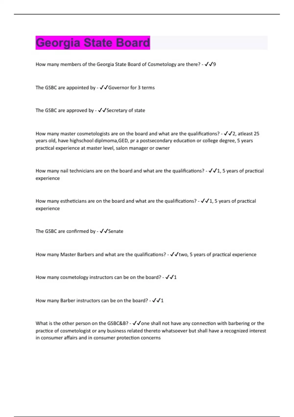 ow many members of the Georgia State Board of Cosmetology are there? - 9 The GSBC are appointed by - Governor for 3 terms The GSBC are approved by - Secretary of state How many master cosmetologists are on the board and what are the qualifications? - 2, atleast 25 years old, have highschool diplmoma,GED, pr a postsecondary education or college degree, 5 years practical experience at master level, salon manager or owner How many nail technicians are on the board and what are the qualifications? - 1, 5 years of practical experience How many estheticians are on the board and what are the qualifications? - 1, 5 years of practical experience The GSBC are confirmed by - Senate How many Master Barbers and what are the qualifications? - two, 5 years of practical experience How many cosmetology instructors can be on the board? - 1 How many Barber instructors can be on the board? - 1 What is the other person on the GSBC&B? - one shall not have any connection with barbering or the practice of cosmetologist or any business related thereto whatsoever but shall have a recognized interest in consumer affairs and in consumer protection concerns