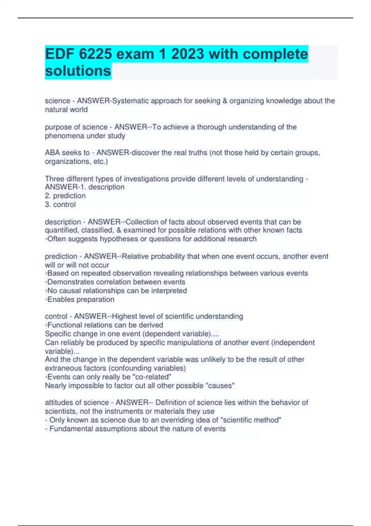 EDF 6225 exam 1 2023 with complete solutions science - ANSWER-Systematic approach for seeking & organizing knowledge about the natural world purpose of science - ANSWER-◦To achieve a thorough understanding of the phenomena under study ABA seeks to - ANSWER-discover the real truths (not those held by certain groups, organizations, etc.) Three different types of investigations provide different levels of understanding - ANSWER-1. description 2. prediction 3. control description - ANSWER-◦Collection of facts about observed events that can be quantified, classified, & examined for possible relations with other known facts ◦Often suggests hypotheses or questions for additional research