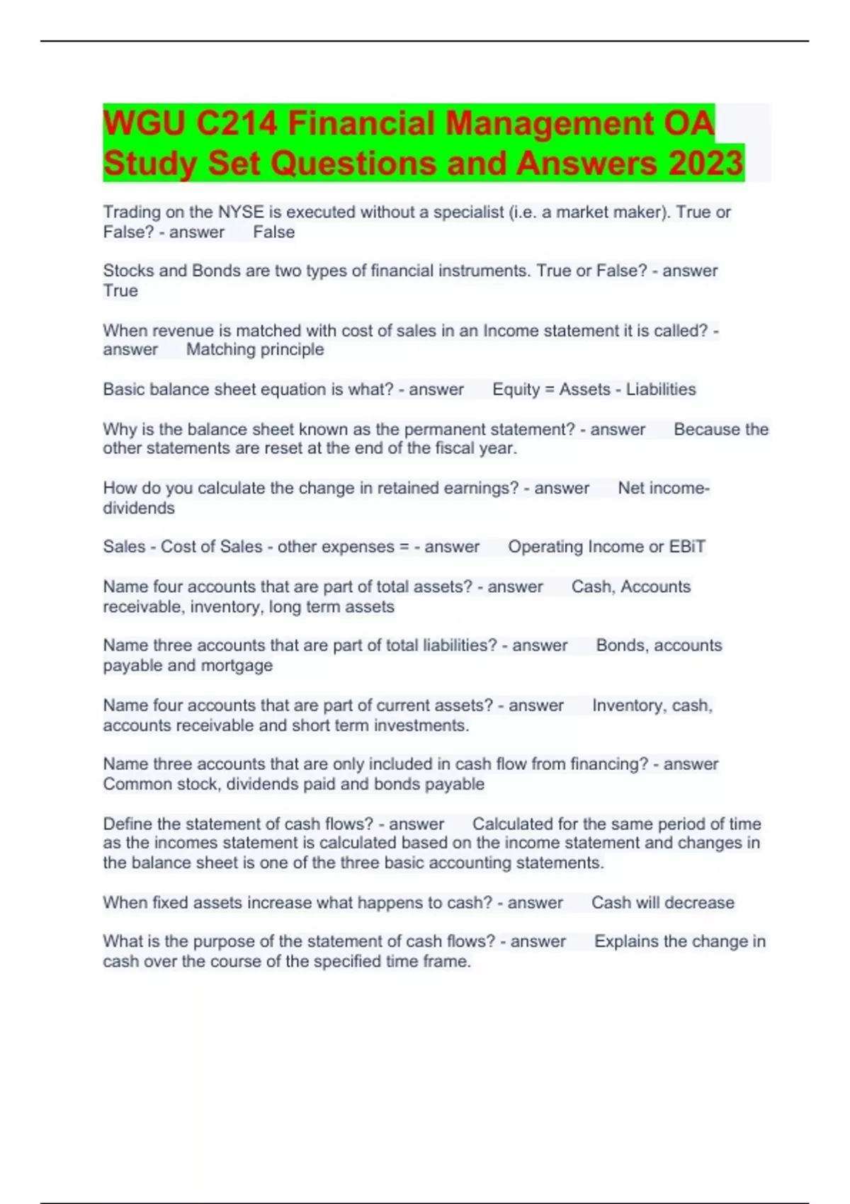WGU C214 Financial Management OA Study Set Questions and Answers 2023