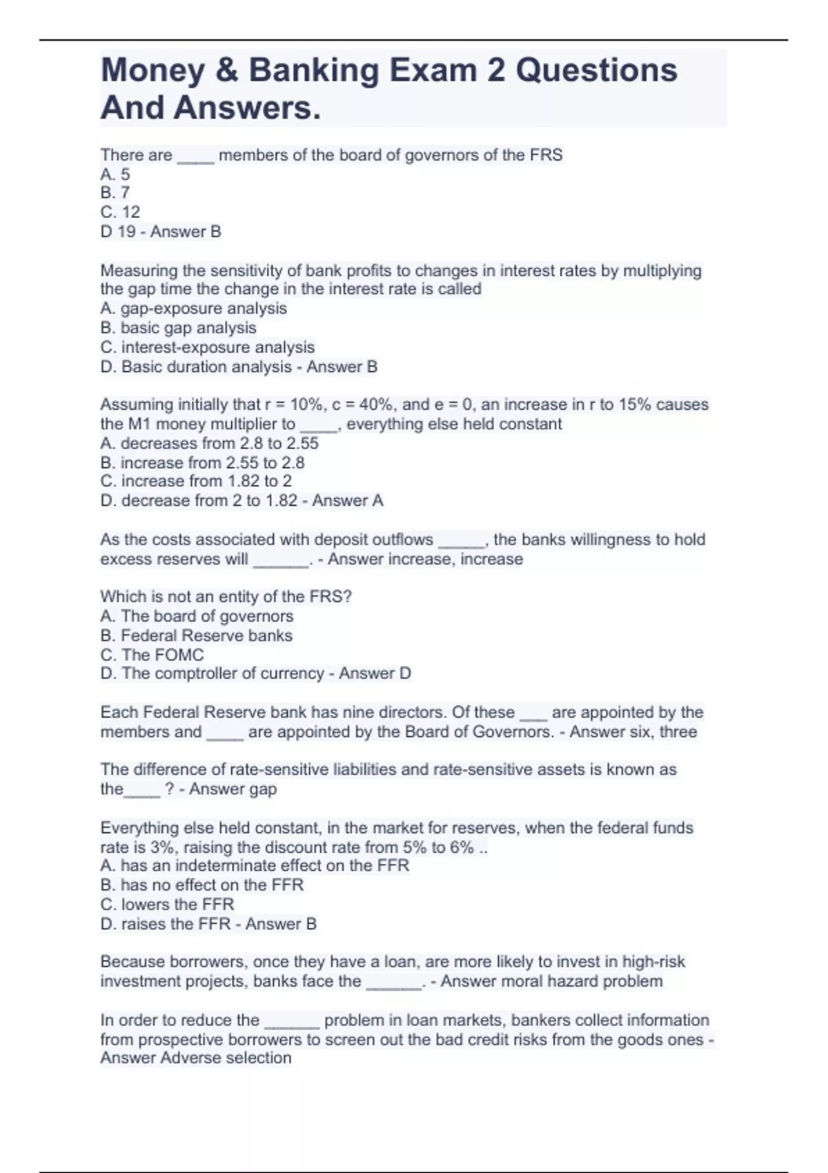 Money & Banking Exam 2 Questions And Answers.