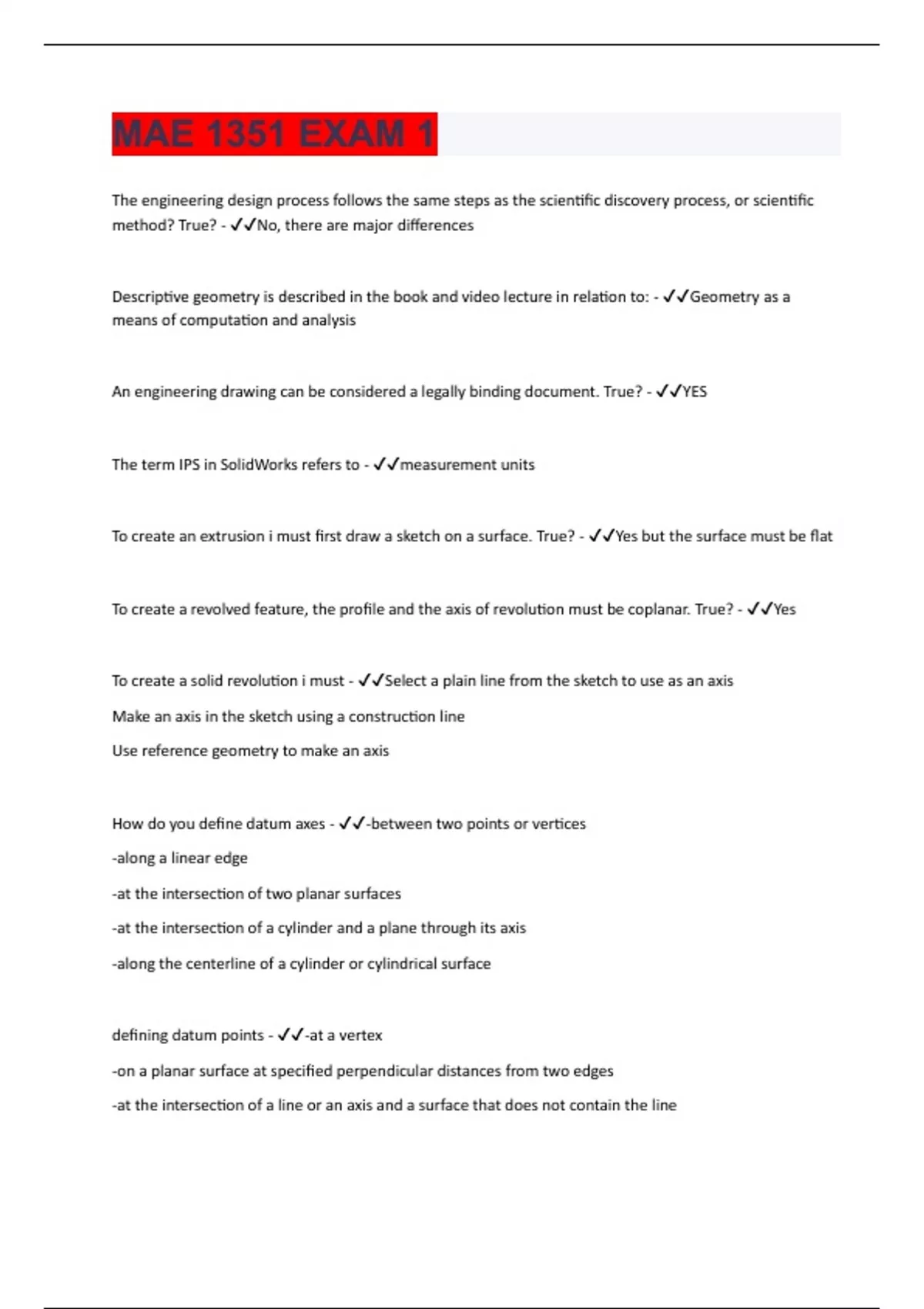 The engineering design process follows the same steps as the scientific discovery process, or scientific method? True? - No, there are major differences Descriptive geometry is described in the book and video lecture in relation to: - Geometry as a means of computation and analysis An engineering drawing can be considered a legally binding document. True? - YES The term IPS in SolidWorks refers to - measurement units To create an extrusion i must first draw a sketch on a surface. True? - Yes but the surface must be flat To create a revolved feature, the profile and the axis of revolution must be coplanar. True? - Yes To create a solid revolution i must - Select a plain line from the sketch to use as an axis Make an axis in the sketch using a construction line Use reference geometry to make an axis How do you define datum axes - -between two points or vertices -along a linear edge -at the intersection of two planar surfaces -at the intersection of a cylinder and a plane through its axis -along the centerline of a cylinder or cylindrical surface defining datum points - -at a vertex -on a planar surface at specified perpendicular distances from two edges -at the intersection of a line or an axis and a surface that does not contain the line