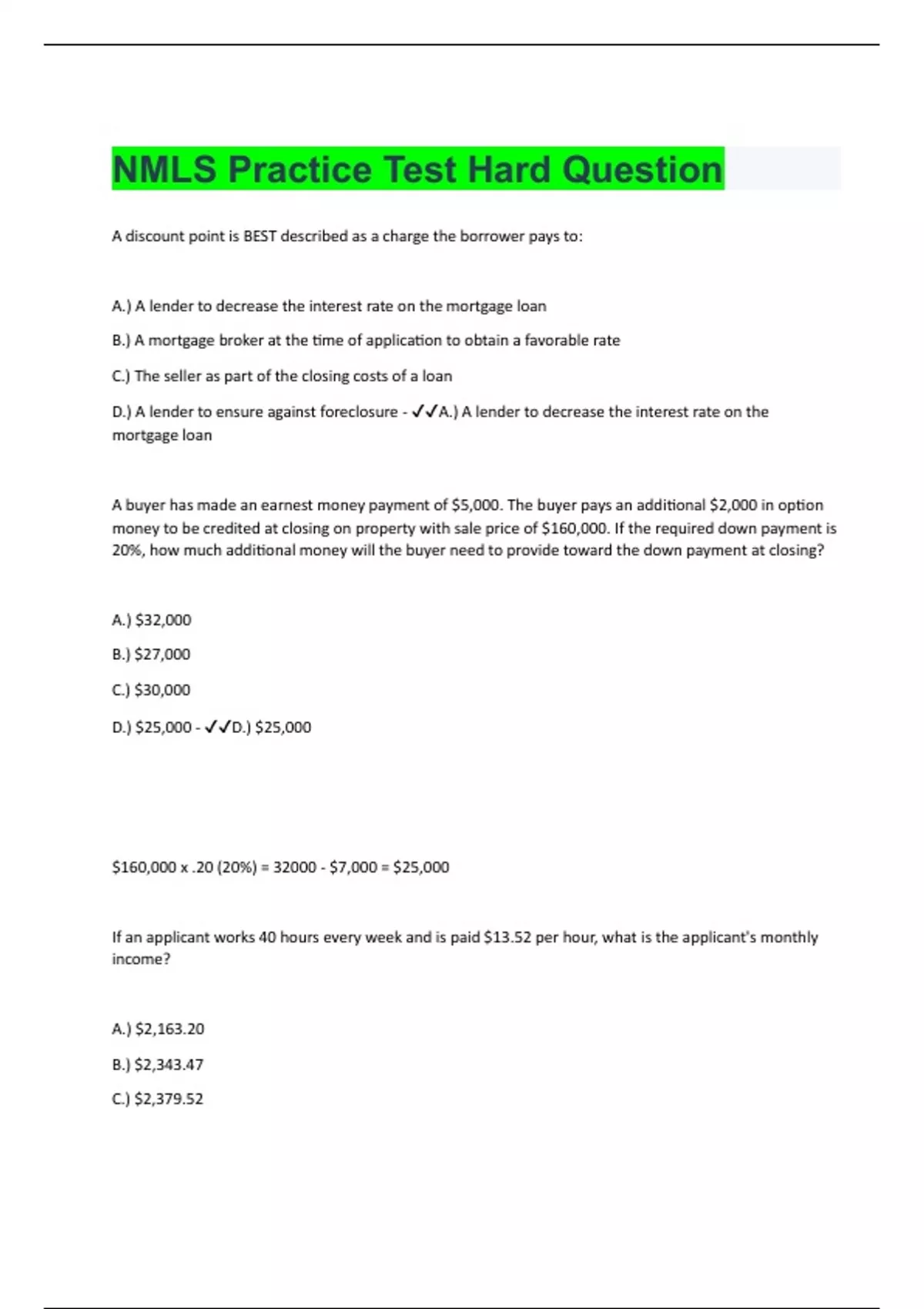 A discount point is BEST described as a charge the borrower pays to: A.) A lender to decrease the interest rate on the mortgage loan B.) A mortgage broker at the time of application to obtain a favorable rate C.) The seller as part of the closing costs of a loan D.) A lender to ensure against foreclosure - A.) A lender to decrease the interest rate on the mortgage loan A buyer has made an earnest money payment of $5,000. The buyer pays an additional $2,000 in option money to be credited at closing on property with sale price of $160,000. If the required down payment is 20%, how much additional money will the buyer need to provide toward the down payment at closing? A.) $32,000 B.) $27,000 C.) $30,000 D.) $25,000 - D.) $25,000 $160,000 x .20 (20%) = 32000 - $7,000 = $25,000 If an applicant works 40 hours every week and is paid $13.52 per hour, what is the applicant's monthly income? A.) $2,163.20 B.) $2,343.47 C.) $2,379.52D.) $2,487.68 - B.) $2,3