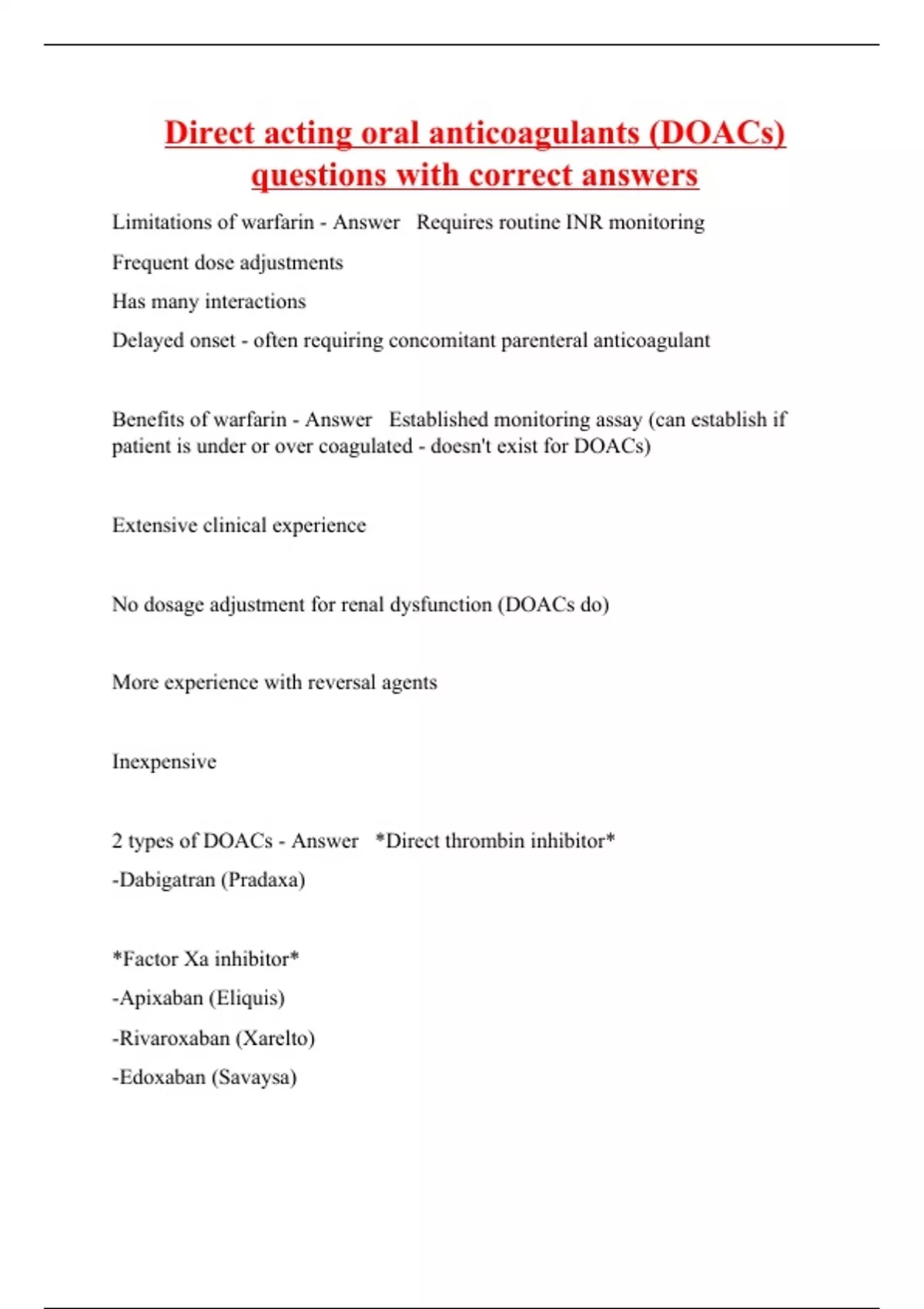 Limitations of warfarin - Answer Requires routine INR monitoring Frequent dose adjustments Has many interactions Delayed onset - often requiring concomitant parenteral anticoagulant Benefits of warfarin - Answer Established monitoring assay (can establish if patient is under or over coagulated - doesn't exist for DOACs) Extensive clinical experience No dosage adjustment for renal dysfunction (DOACs do) More experience with reversal agents Inexpensive 2 types of DOACs - Answer *Direct thrombin inhibitor* -Dabigatran (Pradaxa) *Factor Xa inhibitor* -Apixaban (Eliquis) -Rivaroxaban (Xarelto) -Edoxaban (Savaysa)