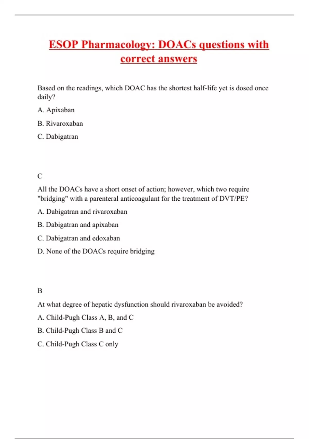 Based on the readings, which DOAC has the shortest half-life yet is dosed once daily? A. Apixaban B. Rivaroxaban C. Dabigatran C All the DOACs have a short onset of action; however, which two require "bridging" with a parenteral anticoagulant for the treatment of DVT/PE? A. Dabigatran and rivaroxaban B. Dabigatran and apixaban C. Dabigatran and edoxaban D. None of the DOACs require bridging B At what degree of hepatic dysfunction should rivaroxaban be avoided? A. Child-Pugh Class A, B, and C B. Child-Pugh Class B and C C. Child-Pugh Class C only FALSE