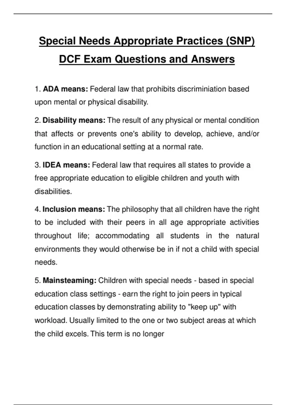 Special Needs Appropriate Practices (SNP) DCF Exam Questions and Answers 1. ADA means: Federal law that prohibits discriminiation based upon mental or physical disability. 2. Disability means: The result of any physical or mental condition that affects or prevents one's ability to develop, achieve, and/or function in an educational setting at a normal rate. 3. IDEA means: Federal law that requires all states to provide a free appropriate education to eligible children and youth with disabilities. 4. Inclusion means: The philosophy that all children have the right to be included with their peers in all age appropriate activities throughout life; accommodating all students in the natural environments they would otherwise be in if not a child with special needs. 5. Mainsteaming: Children with special needs - based in special education class settings - earn the right to join peers in typical education classes by demonstrating ability to "keep up" with workload. Usually limited to the one or two subject areas at which the child excels. This term is no longer