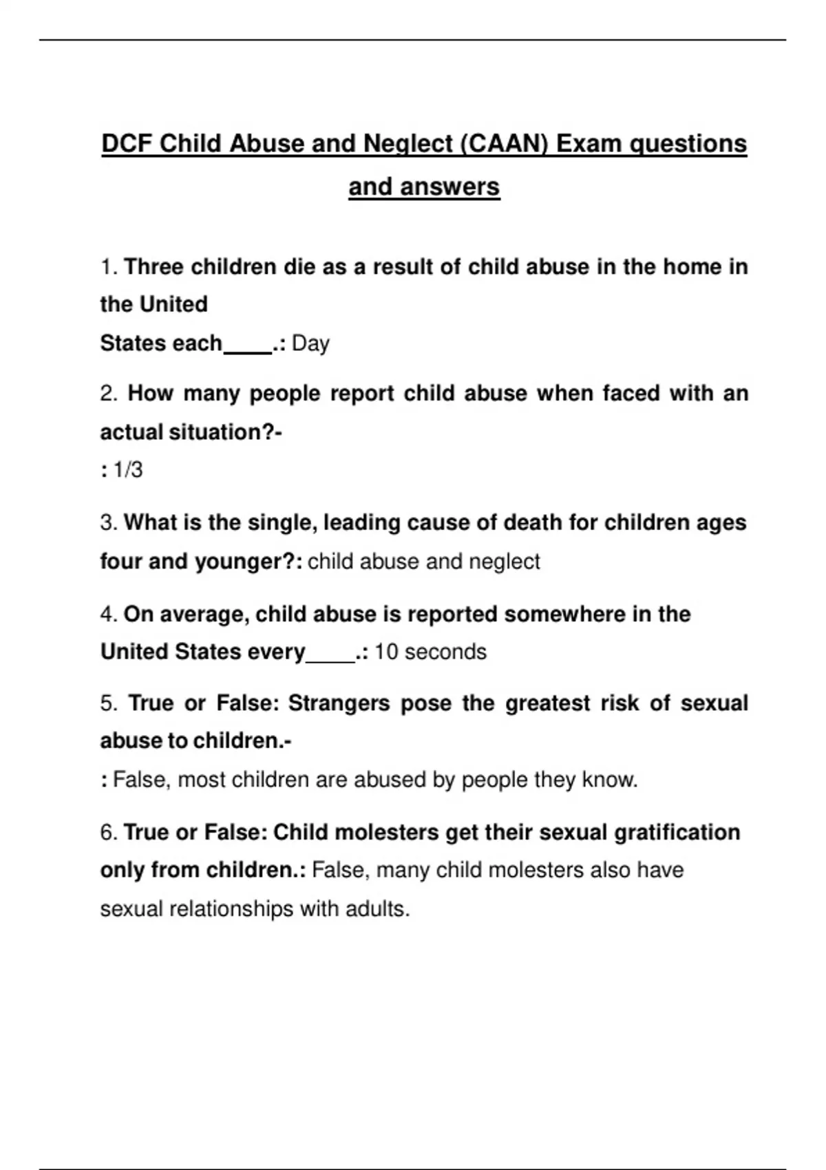 DCF Child Abuse and Neglect (CAAN) Exam questions