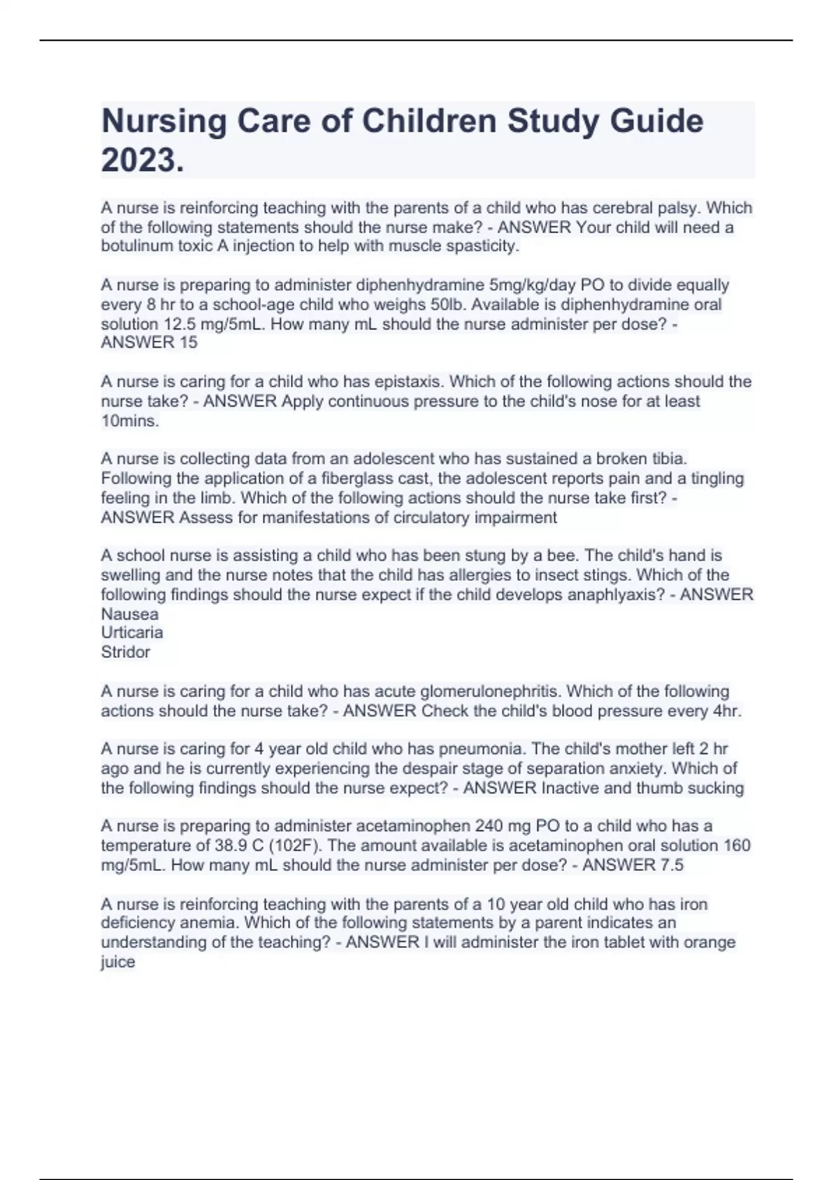 Nursing Care of Children Study Guide 2023.A nurse is reinforcing teaching with the parents of a child who has cerebral palsy. Which of the following statements should the nurse make? - ANSWER Your child will need a botulinum toxic A injection to help with muscle spasticity. A nurse is preparing to administer diphenhydramine 5mg/kg/day PO to divide equally every 8 hr to a school-age child who weighs 50lb. Available is diphenhydramine oral solution 12.5 mg/5mL. How many mL should the nurse administer per dose? - ANSWER 15 A nurse is caring for a child who has epistaxis. Which of the following actions should the nurse take? - ANSWER Apply continuous pressure to the child's nose for at least 10mins. A nurse is collecting data from an adolescent who has sustained a broken tibia. Following the application of a fiberglass cast, the adolescent reports pain and a tingling feeling in the limb. Which of the following actions should the nurse take first? - ANSWER Assess for manifestations of circulatory impairment A school nurse is assisting a child who has been stung by a bee. The child's hand is swelling and the nurse notes that the child has allergies to insect stings. Which of the following findings should the nurse expect if the child develops anaphlyaxis? - ANSWER Nausea Urticaria Stridor