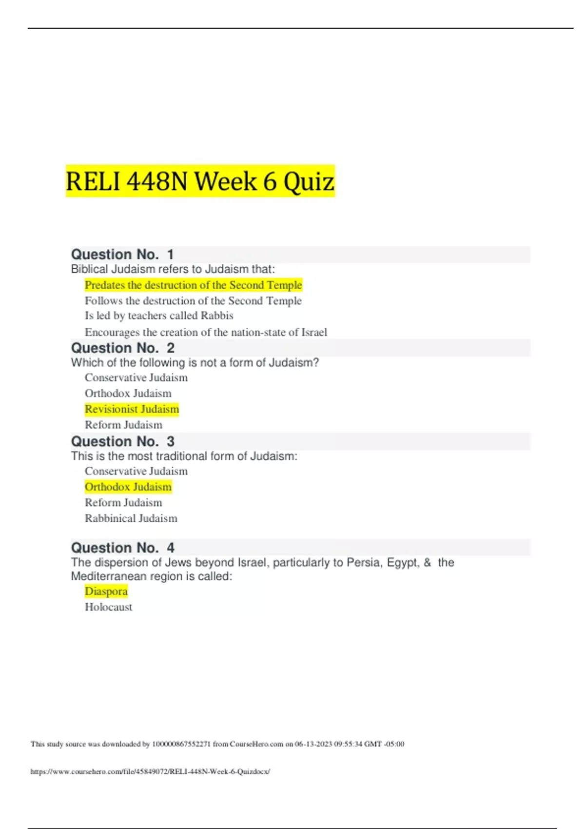 Question No. 1 Biblical Judaism refers to Judaism that: Predates the destruction of the Second Temple Follows the destruction of the Second Temple Is led by teachers called Rabbis Encourages the cr eation of the nation-state of Israel Question No. 2 Which of the following is not a form of Judaism? Conservative Judaism Orthodox Judaism Revisionist Judaism Reform Judaism Question No. 3 This is the most traditional form of Judaism: Conservative Judaism Orthodox Judaism Reform Judaism Rabbinical Judaism Question No. 4 The dispersion of Jews beyond Israel, particularly to Persia, Egypt, & the Mediterranean region is called: Diaspora Holocaust Essenes Ashkenazim Question No. 5 This term means “ritually correct” & refers mainly to the preparation & consumption of food: Kosher Midrash Tallit Bar (Bat) Mitzvah Question No. 6 Members of the priestly families, living primarily in Jerusalem, who were in charge of the temple & its activities were called: Pharisees Zealots Essenes Sadducees Question No. 7 The most recent period in Jewish history, called the reform, is characterized by all of the following except: The innovations of the European Enlightenment The laws of Napoleon A movement away from modern political & philosophical ideals The inspiration of the American & French Revolutions Question No. 8 Isaiah was a: King Prophet Priest Rabbi Question No. 9 The list of authoritative books (of the Christian Bible) is called: The Canon The Gospels The Epistles The Torah Question No. 10 The preparatory period of penance, preceding Easter & lasting 40 days, is called: Passover Lent Advent Pentecost Question No. 11 The 95 Theses were a set of demands for change & reformation that were made by: John Calvin Martin Luther Henry VIII Huldrych Zwingli Question No. 12 The gospel that has been referred to as the “women’s gospel” is the gospel of: Matthew Mark Luke John Question No. 13 Martin Luther’s reforms included: An end to the sale of indulgences The removal of the term filioque from the Nicene Creed The acceptance of the doctrine of predestination The rejection of a dependence on ordained clergy Question No. 14 The belief that because God is all-powerful & all-knowing, a human being’s ultimate reward or punishment is already decreed by God is called: Predetermination Free Will Eternalism Predestination Question No. 15 Our text defines all of the following forms of Christianity as “non-traditional” except: Egyptian Coptic Christianity Mormonism Jehovah’s Witnesses Unitarian