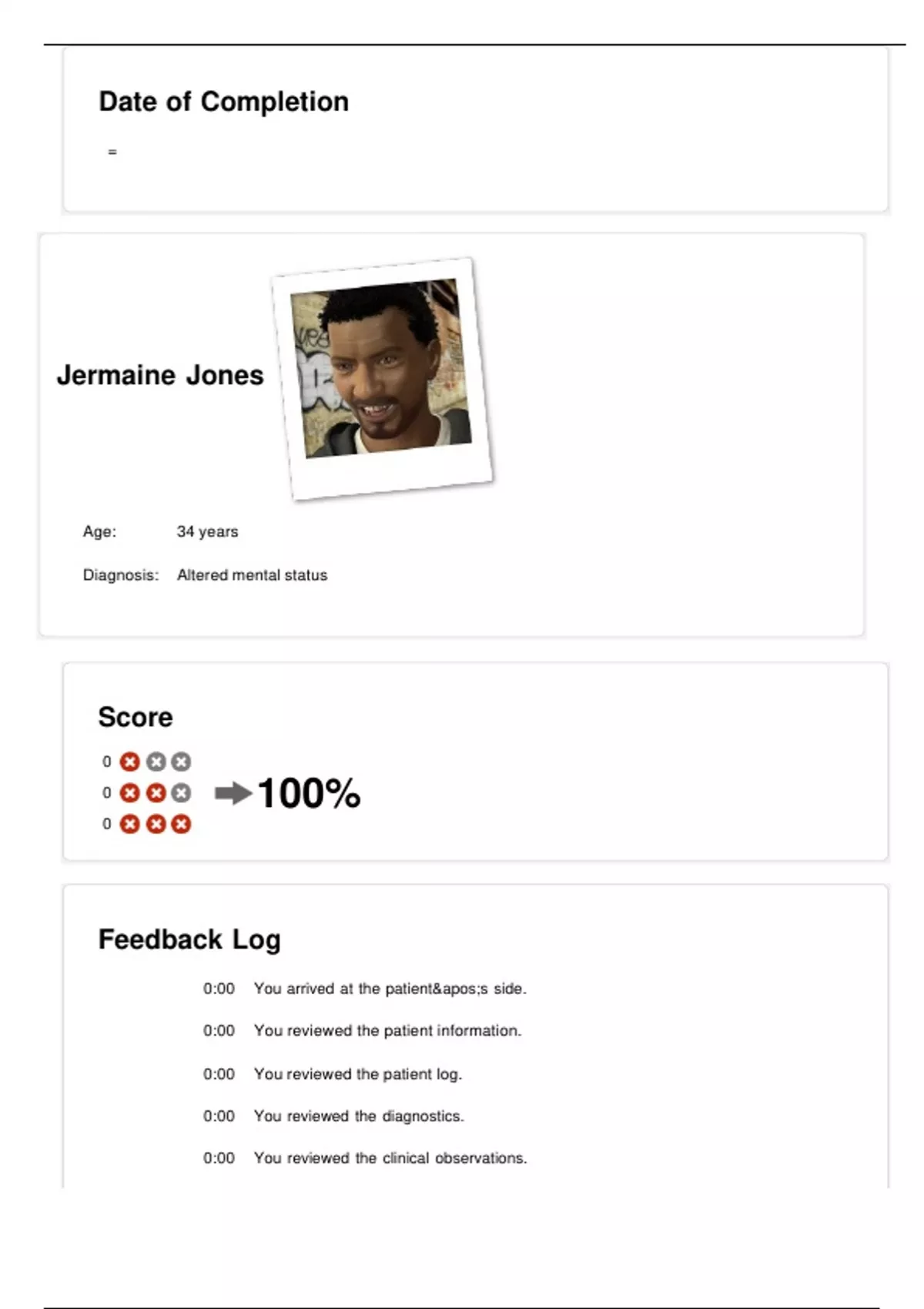 Date of Completion = Score 0 0 0 100% Feedback Log 0:00 You arrived at the patient's side. 0:00 You reviewed the patient information. 0:00 You reviewed the patient log. 0:00 You reviewed the diagnostics. 0:00 You reviewed the clinical observations. 0:00 You reviewed the MAR. 0:00 You reviewed the 12-lead ECG. 0:00 You reviewed the orders. 0:00 You introduced yourself. 0:04 You washed your hands. To maintain patient safety, it is important to wash your hands as soon as you enter the room. 0:10 Patient status - ECG: Sinus rhythm. Heart rate: 95. Pulse: Present. Blood pressure: 123/74 mm Hg. Respiration: 12. Conscious state: Somnolent. SpO2: 95%. Temp: 99 F (37 C) 1:10 Patient status - ECG: Sinus rhythm. Heart rate: 95. Pulse: Present. Blood pressure: 123/74 mm Hg. Respiration: 12. Conscious state: Somnolent. SpO2: 95%. Temp: 99 F (37 C) 1:16 You identified the patient. To maintain patient safety, it is important that you quickly identify the patient. 1:26 You asked if the patient was Allergyallergic to anything. He replied: 'No, I am not allergic to anything.' 1:50 You looked for normal breathing. He is breathing at 12 breaths per minute. The chest is moving equally. 2:10 Patient status - ECG: Sinus rhythm. Heart rate: 95. Pulse: Present. Blood pressure: 122/73 mm Hg. Respiration: 12. Conscious state: Somnolent. SpO2: 95%. Temp: 99 F (37 C) 2:15 You attached the Pulseoximeterpulse oximeter. It is a good idea to monitor the saturation and pulse here. This will allow you to reassess the patient continuously. 2:26 You checked the radial pulse. The pulse is strong, 95 per minute, and regular. It is correct to assess the patient's vital signs. 2:48 You measured the Temperaturetemperature in the ear. The temperature was 99 F (37 C). 3:07 You attached the automatic noninvasive blood pressure (NIBP) measurement cuff. This will allow you to reassess the patient continuously. 3:10 Patient status - ECG: Sinus rhythm. Heart rate: 95. Pulse: Present. Blood pressure: 125/75 mm Hg. Respiration: 12. Conscious state: Somnolent. SpO2: 95%. Temp: 99 F (37 C) 3:18 You assessed the patient's sedation level using the Pasero Sedation Scale. This was reasonable. The patient was drowsy but arousable. Tended to drift off to sleep. On the Pasero Opioid-Induced Sedation Scale, the patient was graded to 3. 3:36 You assessed the patient's IV. The site had no redness, swelling, infiltration, bleeding, or drainage. The dressing was dry and intact. This is correct. Assessing any IVs the patient has is always important. 3:51 You asked the patient if he had any pain. He replied: 'No, I don't have any pain.' down, so I took some pills and drank some alcohol. I didn't think it would matter. I probably drank too much as well. At first, I couldn't move, but that is better now.' 4:07 You asked the patient how he felt. He replied: 'I am feeling a little down.' 4:10 Patient status - ECG: Sinus rhythm. Heart rate: 95. Pulse: Present. Blood pressure: 121/72 mm Hg. Respiration: 12. Conscious state: Somnolent. SpO2: 95%. Temp: 99 F (37 C) 4:13 You asked the patient when the symptoms started. He replied: 'A few days ago.' 4:21 You asked the patient what other symptoms he had. He replied: 'I'm a bit dizzy.' 4:31 You asked the patient if he had had anything to eat or drink today. He replied: 'I'm not sure about that.' 4:34 You asked the patient if he had any alcohol to drink today. He replied: 'I drank 3 beers. Normally I do not drink much alcohol.' 4:45 You asked if the patient was Allergyallergic to anything. He replied: 'No, I am not allergic to anything.' 4:48 You asked the patient if he had any medical problems. He replied: 'I have been suffering from depression for a few years now.' 4:52 You asked the patient: Do you take any prescription medication? He replied: 'I took one of my wife's Xanax tablets this afternoon. My wife told me they were 0.5 mg tablets. And I took my prescribed depression medication this morning.' 4:59 You asked the patient: Do you take any over-the-counter or herbal medication? He replied: 'No, I don't.' 5:00 You performed medication reconciliation. This was reasonable. 5:04 You asked the patient if he had taken his medication, if any. He replied: 'I took my medicine this morning. But I also took one of my wife's Xanax.' 5:07 You asked the patient: When did you last take your medication? He replied: 'I took the Xanax this afternoon.' 5:10 Patient status - ECG: Sinus rhythm. Heart rate: 95. Pulse: Present. Blood pressure: 126/75 mm Hg. Respiration: 12. Conscious state: Somnolent. SpO2: 95%. Temp: 99 F (37 C) 5:10 You asked the patient: How much medication did you take? He replied: 'They were 0.5-mg tablets. I just took one.' 5:14 You asked the patient: Why did you take the medication? He replied: 'I took it to calm down. I thought I it would be a no big deal.' 5:20 You asked the patient: Do you use any recreational drugs? He replied: 'No.' 5:23 You asked the patient if he was a smoker. He replied: 'I don't smoke.' 5:27 You asked the patient: Do you have any thoughts of harming yourself? He replied: 'No, not at all.' 5:32 You asked the patient: Have you lost interest in your daily activities? He replied: 'No. I don't think so.' 5:34 You asked the patient: Do you have trouble sleeping? He replied: 'No.' 5:36 You asked the patient: Have you lost your appetite lately? He replied: 'Yes. I do not eat as much as I used to. I also think I lost a few pounds.' 5:41 You asked the patient: Are you feeling sad? He replied: 'I'm sad because of my father's death 1 year ago.' 5:44 You asked the patient what year it is. He replied: 'The year is 2020.' 5:48 You asked the patient if he knew where he was. He replied: 'This looks like a hospital.' 5:51 You asked the patient what date it was. He replied: 'Hmm. I'm not sure.' 5:55 You asked the patient: Can you tell me why you are here? He replied: 'I am here because I took some medication and drank some alcohol.' 6:10 Patient status - ECG: Sinus rhythm. Heart rate: 95. Pulse: Presen