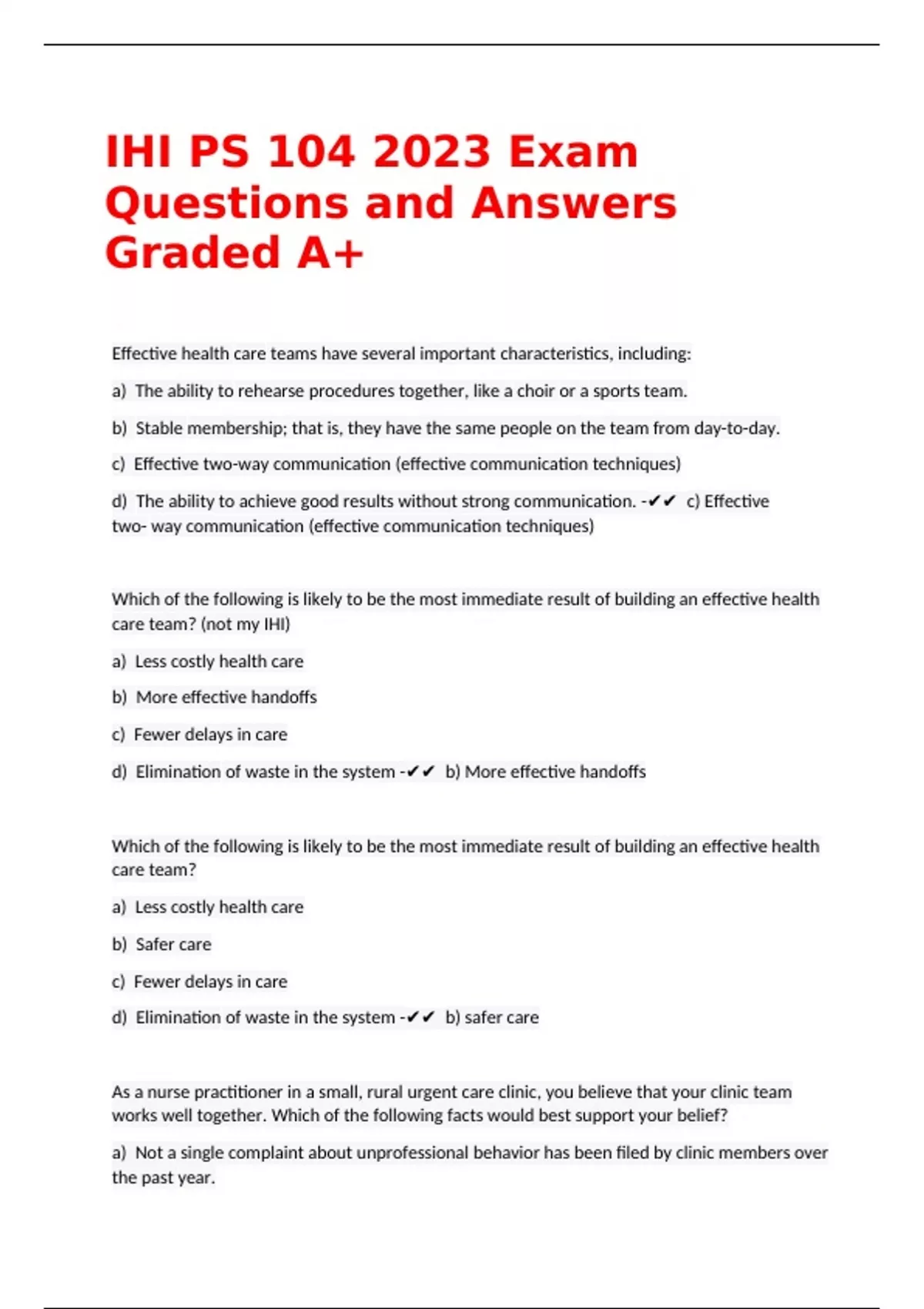 IHI PS 104 Exam Questions and Answers Graded A+ Effective health care teams have several important characteristics, including: - Effective communication techniques. Which of the following is likely to be the most immediate result of building an effective health care team? - Safer care As a nurse practitioner in a small, rural urgent care clinic, you believe that your clinic team works well together. Which of the following facts would best support your belief - The team routinely takes a moment to discuss the plan and voice concerns before doing a procedure. One reason it's critical for caregivers to improve their teams' effectiveness is: - Effective teams reduce the risk of errors by providing a "safety net" for individual caregivers. When considering your role within a health care team, it is important to keep in mind that: - No matter what profession you belong to, you will be a member of the team and must work intentionally toward making that team effective. What is "SBAR"? - A system for delivering information What has Linda just done? - Provided a read back At this point, what would an effective team leader do? - Conduct a debriefing