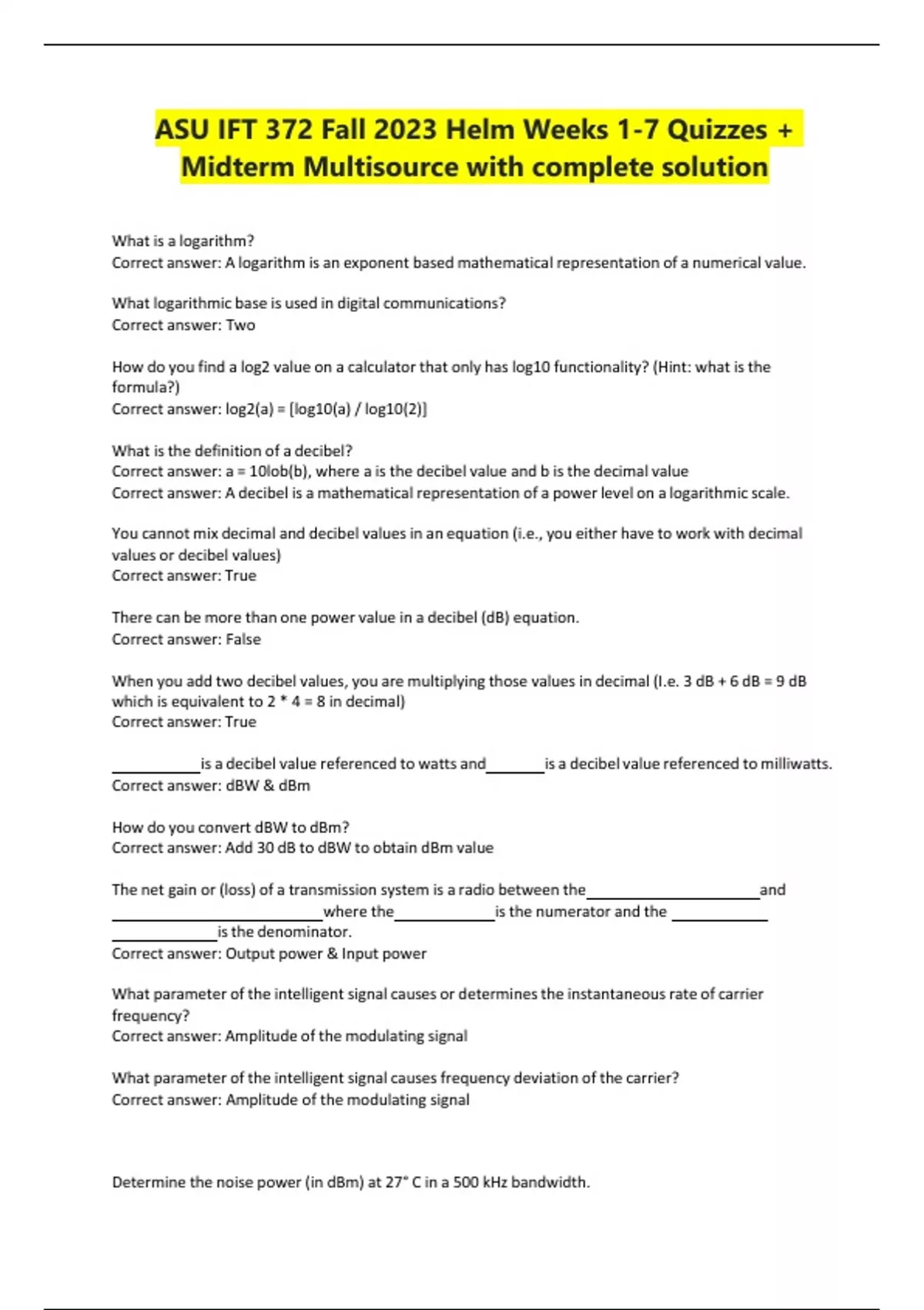 ASU IFT 372 Fall 2023 Helm Weeks 1-7 Quizzes + Midterm Multisource with complete solution What is a logarithm? Correct answer: A logarithm is an exponent based mathematical representation of a numerical value. What logarithmic base is used in digital communications? Correct answer: Two How do you find a log2 value on a calculator that only has log10 functionality? (Hint: what is the formula?) Correct answer: log2(a) = [log10(a) / log10(2)] What is the definition of a decibel? Correct answer: a = 10lob(b), where a is the decibel value and b is the decimal value Correct answer: A decibel is a mathematical representation of a power level on a logarithmic scale. You cannot mix decimal and decibel values in an equation (i.e., you either have to work with decimal values or decibel values) Correct answer: True There can be more than one power value in a decibel (dB) equation. Correct answer: False When you add two decibel values, you are multiplying those values in decimal (I.e. 3 dB + 6 dB = 9 dB which is equivalent to 2 * 4 = 8 in decimal) Correct answer: True is a decibel value referenced to watts and is a decibel value referenced to milliwatts. Correct answer: dBW & dBm How do you convert dBW to dBm? Correct answer: Add 30 dB to dBW to obtain dBm value The net gain or (loss) of a transmission system is a radio between the and where the is the numerator and the isthe denominator. Correct answer: Output power & Input power What parameter of the intelligent signal causes or determinesthe instantaneousrate of carrier frequency? Correct answer: Amplitude of the modulating signal What parameter of the intelligent signal causes frequency deviation of the carrier? Correct answer: Amplitude of the modulating signal