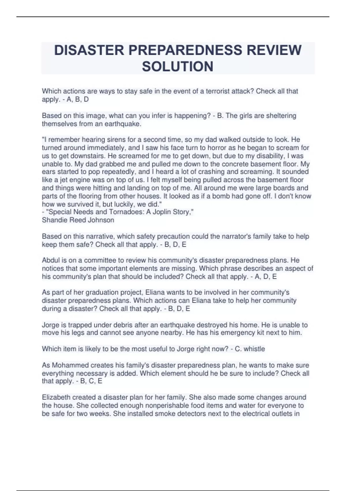 DISASTER PREPAREDNESS REVIEW SOLUTION Which actions are ways to stay safe in the event of a terrorist attack? Check all that apply. Based on this image, what can you infer is happening? "I remember hearing sirens for a second time, so my dad walked outside to look. He turned around immediately, and I saw his face turn to horror as he began to scream for us to get downstairs. He screamed for me to get down, but due to my disability, I was unable to. My dad grabbed me and pulled me down to the concrete basement floor. My ears started to pop repeatedly, and I heard a lot of crashing and screaming. It sounded like a jet engine was on top of us. I felt myself being pulled across the basement floor and things were hitting and landing on top of me. All around me were large boards and parts of the flooring from other houses. It looked as if a bomb had gone off. I don't know how we survived it, but luckily, we did." - "Special Needs and Tornadoes: A Joplin Story," Shandie Reed Johnson Based on this narrative, which safety precaution could the narrator's family take to help keep them safe? Check all that apply. Abdul is on a committee to review his community's disaster preparedness plans. He notices that some important elements are missing. Which phrase describes an aspect of his community's plan that should be included? Check all that apply. As part of her graduation project, Eliana wants to be involved in her community's disaster preparedness plans. Which actions can Eliana take to help her community during a disaster? Check all that apply. Jorge is trapped under debris after an earthquake destroyed his home. He is unable to move his legs and cannot see anyone nearby. He has his emergency kit next to him. Which item is likely to be the most useful to Jorge right now? As Mohammed creates his family's disaster preparedness plan, he wants to make sure everything necessary is added. Which element should he be sure to include? Check all that apply