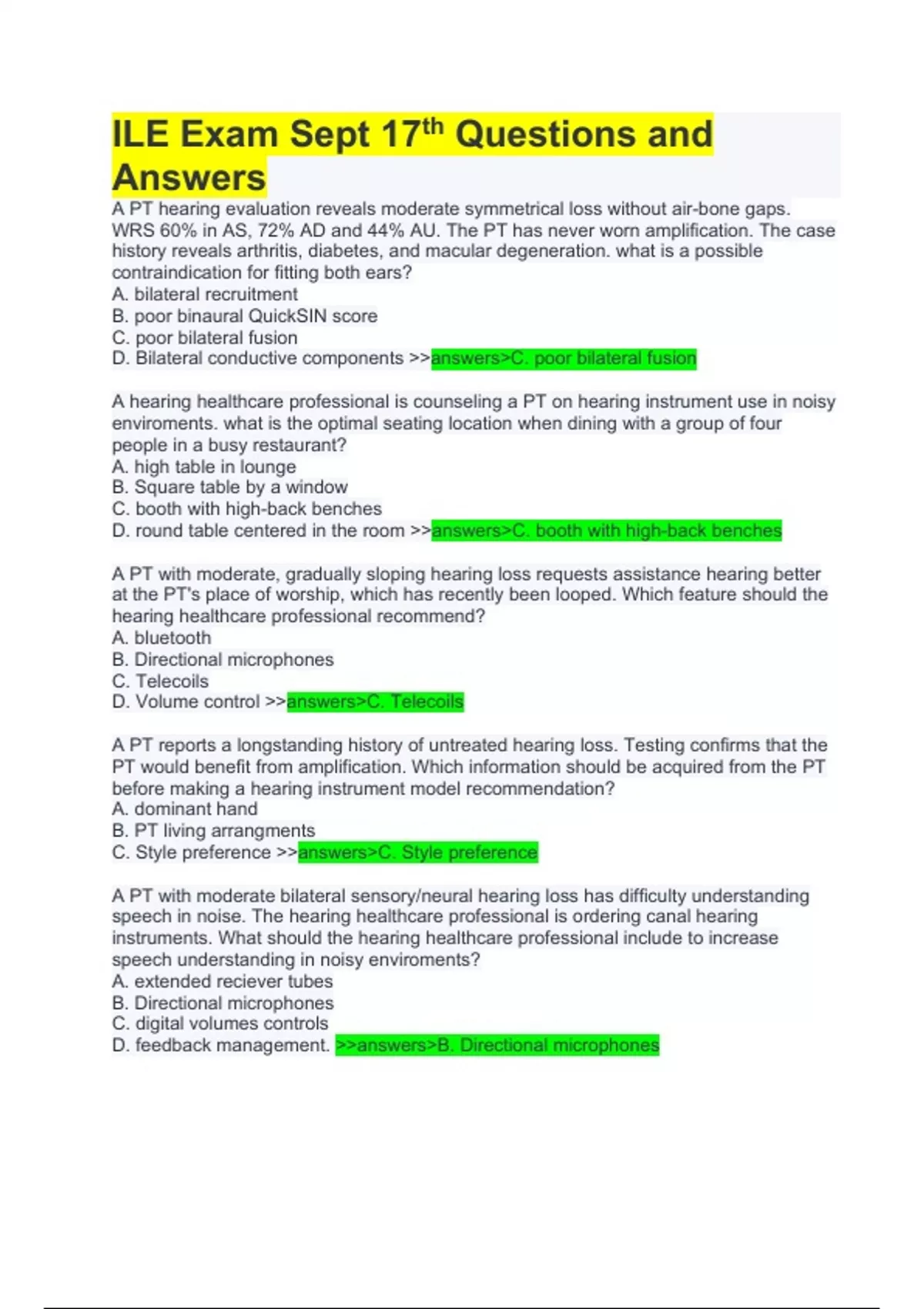 ILE Exam Sept 17th Questions and Answers. A PT hearing evaluation reveals moderate symmetrical loss without air-bone gaps. WRS 60% in AS, 72% AD and 44% AU. The PT has never worn amplification. The case history reveals arthritis, diabetes, and macular degeneration. what is a possible contraindication for fitting both ears? A. bilateral recruitment B. poor binaural QuickSIN score C. poor bilateral fusion D. Bilateral conductive components >>answers>C. poor bilateral fusion A hearing healthcare professional is counseling a PT on hearing instrument use in noisy enviroments. what is the optimal seating location when dining with a group of four people in a busy restaurant? A. high table in lounge B. Square table by a window C. booth with high-back benches D. round table centered in the room >>answers>C. booth with high-back benches A PT with moderate, gradually sloping hearing loss requests assistance hearing better at the PT's place of worship, which has recently been looped. Which feature should the hearing healthcare professional recommend? A. bluetooth B. Directional microphones C. Telecoils D. Volume control >>answers>C. Telecoils A PT reports a longstanding history of untreated hearing loss. Testing confirms that the PT would benefit from amplification. Which information should be acquired from the PT before making a hearing instrument model recommendation? A. dominant hand B. PT living arrangments C. Style preference >>answers>C. Style preference A PT with moderate bilateral sensory/neural hearing loss has difficulty understanding speech in noise. The hearing healthcare professional is ordering canal hearing instruments. What should the hearing healthcare professional include to increase speech understanding in noisy enviroments? A. extended reciever tubes B. Directional microphones C. digital volumes controls D. feedback management. >>answers>B. Directional microphones.