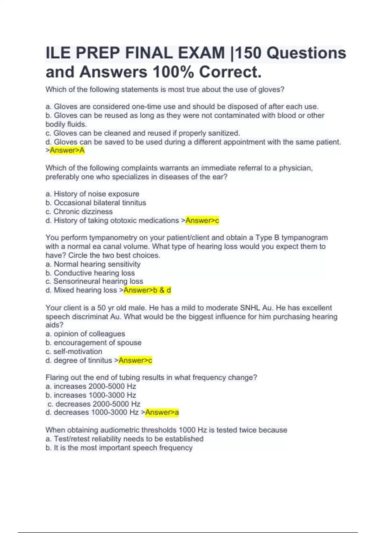 ILE PREP FINAL EXAM |150 Questions and Answers 100% Correct. Which of the following statements is most true about the use of gloves? a. Gloves are considered one-time use and should be disposed of after each use. b. Gloves can be reused as long as they were not contaminated with blood or other bodily fluids. c. Gloves can be cleaned and reused if properly sanitized. d. Gloves can be saved to be used during a different appointment with the same patient. >Answer>A Which of the following complaints warrants an immediate referral to a physician, preferably one who specializes in diseases of the ear? a. History of noise exposure b. Occasional bilateral tinnitus c. Chronic dizziness d. History of taking ototoxic medications >Answer>c You perform tympanometry on your patient/client and obtain a Type B tympanogram with a normal ea canal volume. What type of hearing loss would you expect them to have? Circle the two best choices. a. Normal hearing sensitivity b. Conductive hearing loss c. Sensorineural hearing loss d. Mixed hearing loss >Answer>b & d Your client is a 50 yr old male. He has a mild to moderate SNHL Au. He has excellent speech discriminat Au. What would be the biggest influence for him purchasing hearing aids? a. opinion of colleagues b. encouragement of spouse c. self-motivation d. degree of tinnitus >Answer>c Flaring out the end of tubing results in what frequency change? a. increases Hz b. increases Hz c. decreases Hz d. decreases Hz >Answer>a When obtaining audiometric thresholds 1000 Hz is tested twice because a. Test/retest reliability needs to be established b. It is the most important speech frequency c. It is the hardest tone to hear d. Both A and B >Answer>a Which of the following is not an advantage for using acrylic earmolds? a. extremely durable b. easily modified in the office c. better seal for profound hearing loss d. more easily inserted >Answer>c When taking an ear impression why might your patient cough? a. It's a normal response to cough when nervous b. It's a normal response to cough when Arnold's Reflex is elicited c. It's a normal response to cough when the Stapedial Reflex is elicited d. Stop, use universal precautions and wear a mask, as the client may be contagious >Answer>b Which process refers to the process in which germs are killed 100%? a. Cleaning b. Disinfecting c. Sterilization d. None of the above >Answer>c Which tool should be utilized when verifying otoblock placement in the ear canal? a. otolight b. otoscope c. visual inspection d. tip of syringe >Answer>b Which of the following dynamic ranges would indicate recruitment? a. 25dB b. 45dB c. 65dB d. 85dB >Answer>a Recruitment is most common in a.Conductive hearing losses b. Central auditory processing disorders c. Sensorineural hearing losses d. Mixed hearing losses >Answer>c A 54-year-old male patient/client with normal hearing through 1KHz followed by a precipitous drop in thresholds would do best with a. Non-occluding earmolds b. Skeleton earmolds with select-a-vent c. ITC instruments d. A compression circuit >Answer>a Impacted cerumen a. Will not interfere with impression taking b. Should be surgically removed c. Will have little effect on audiometric tests d. Should be removed prior to audiometric evaluation >Answer>d Your patient/client has a very soft, flaccid outer ear. Due to the shape of the pinna it is recommended h have a skeleton ear mold made. What earmold material would work best for his ear texture, AND what anatomical sections of the outer ear must be included in the ear impression in order for the skeleton m to be a success? a. Acrylic material; antitragus, concha bowl, triangular fossa b. Silicone material; concha bowl, antitragus, helix c. Acrylic material; antitragus, concha bowl, antihelix d. Silicone material; antitragus, triangular fossa, antihelix >Answer>c Your patient/client is concerned that when their hearing aids are off during the night they will not hear alarm clock in the morning. What are two assistive devices that could help them? a. Alarm clock with bed shaker b. Alarm clock with high frequency alarm signal c. Sound signaler that activates bedside lamp to flash d. Telephone wake-up call >Answer>A & C You are performing a first fit with a BTE and custom earmold with SAV venting. Although you have run your feedback manager they are still getting a lot of feedback. You do not want to them to lose any mo gain in the high frequencies. What should you do? A. Make a new earmold as it must be a poor fit issue B. Tell them that their hearing aid is just going to feedback C. Use vent plugs to reduce the vent size until feedback is reduced D. Fill their vent with glue so that they do not get feedback >Answer>C What type of earmold should you use when fitting a CROS hearing device? A. full shell b. half shell c. free field c. full shell with SAV venting >Answer>c Endolymph can be found in which part of the cochlea? a. scala vestibuli b. scala media c. scala tympani d. all chambers of the cochlea >Answer>b Which size of venting would be most appropriate for a patient client with thresholds from 250-1K Hz between 0 to 25 dB HL? a. IROS b. Small c. Medium d. Pressure Vent >Answer>a Which of the following causes of feedback might you need to send the HA in for repair? a. Tubing is cracked or split b. Earhook is split c. Vent is too large d. Microphone is loose within the BTE case >Answer>d .