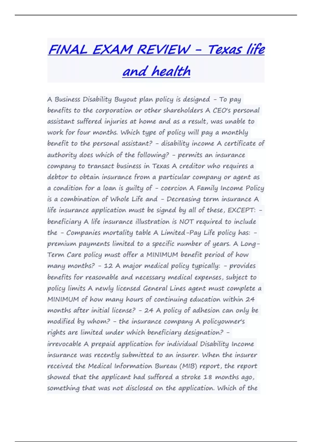 A Business Disability Buyout plan policy is designed - To pay benefits to the corporation or other shareholders A CEO's personal assistant suffered injuries at home and as a result, was unable to work for four months. Which type of policy will pay a monthly benefit to the personal assistant? - disability income A certificate of authority does which of the following? - permits an insurance company to transact business in Texas A creditor who requires a debtor to obtain insurance from a particular company or agent as a condition for a loan is guilty of - coercion A Family Income Policy is a combination of Whole Life and - Decreasing term insurance A life insurance application must be signed by all of these, EXCEPT: - beneficiary A life insurance illustration is NOT required to include the - Companies mortality table A Limited-Pay Life policy has: - premium payments limited to a specific number of years. A Long- Term Care policy must offer a MINIMUM benefit period of how many months? - 12 A major medical policy typically: - provides benefits for reasonable and necessary medical expenses, subject t