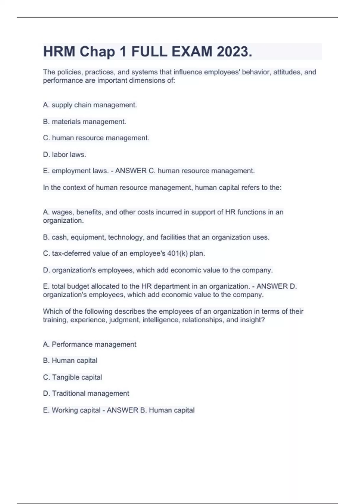 HRM Chap 1 FULL EXAM 2023.The policies, practices, and systems that influence employees' behavior, attitudes, and performance are important dimensions of: A. supply chain management. B. materials management. C. human resource management. D. labor laws. E. employment laws. - ANSWER C. human resource management. In the context of human resource management, human capital refers to the: A. wages, benefits, and other costs incurred in support of HR functions in an organization. B. cash, equipment, technology, and facilities that an organization uses. C. tax-deferred value of an employee's 401(k) plan. D. organization's employees, which add economic value to the company. E. total budget allocated to the HR department in an organization. - ANSWER D. organization's employees, which add economic value to the company. Which of the following describes the employees of an organization in terms of their training, experience, judgment, intelligence, relationships, and insight? A. Performance management B. Human capital C. Tangible capital D. Traditional management E. Working capital - ANSWER B. Human capital Daniel, the director of operations, strongly believes that human resource management