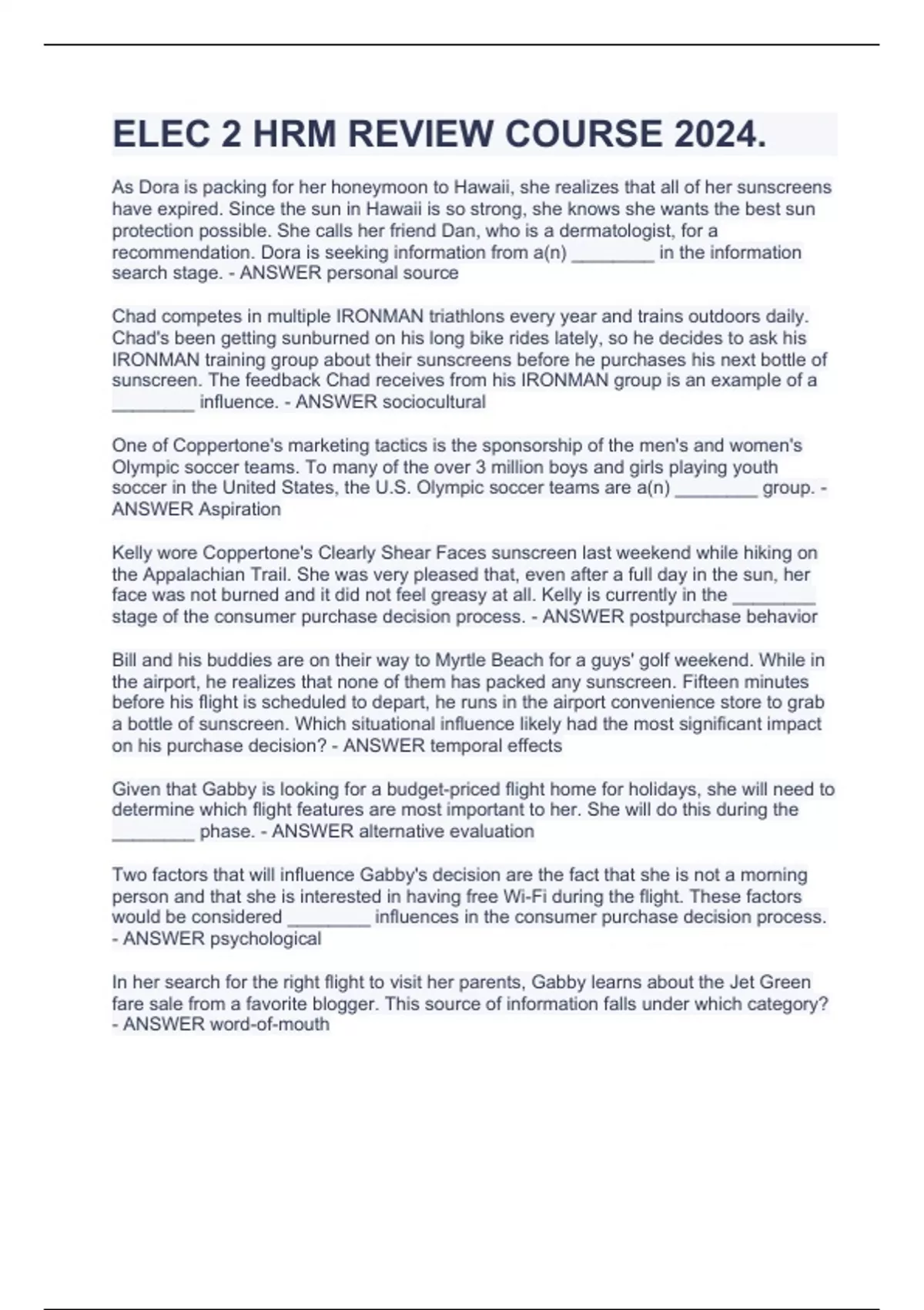 ELEC 2 HRM REVIEW COURSE 2024.As Dora is packing for her honeymoon to Hawaii, she realizes that all of her sunscreens have expired. Since the sun in Hawaii is so strong, she knows she wants the best sun protection possible. She calls her friend Dan, who is a dermatologist, for a recommendation. Dora is seeking information from a(n) ________ in the information search stage. - ANSWER personal source Chad competes in multiple IRONMAN triathlons every year and trains outdoors daily. Chad's been getting sunburned on his long bike rides lately, so he decides to ask his IRONMAN training group about their sunscreens before he purchases his next bottle of sunscreen. The feedback Chad receives from his IRONMAN group is an example of a ________ influence. - ANSWER sociocultural One of Coppertone's marketing tactics is the sponsorship of the men's and women's Olympic soccer teams. To many of the over 3 million boys and girls playing youth soccer in the United States, the U.S. Olympic soccer teams are a(n) ________ group. - ANSWER Aspiration Kelly wore Coppertone's Clearly Shear Faces sunscreen last weekend while hiking on the Appalachian Trail. She was very pleased that, even after a full day in the sun, her face was not burned and it did not feel greasy at all. Kelly is currently in the ________ stage of the consumer purchase decision process. - ANSWER postpurchase behavior Bill and his buddies are on their way to Myrtle Beach for a guys' golf weekend. While in the airport, he realizes that none of them has packed any sunscreen. Fifteen minutes before his flight is scheduled to depart, he runs in the airport convenience store to grab a bottle of sunscreen. Which situational influence likely had the most significant impact on his purchase decision? - ANSWER temporal effects Given that Gabby is looking for a budget-priced flight home for holidays, she will need to determine which flight features are most important to her. She will do this during the ________ phase. - ANSWER alternative evaluation Two factors that will influence Gabby's decision are the fact that she is not a morning person and that she is interested in having free Wi-Fi during the flight. These factors would be considered ________ influences in the consumer purchase decision process. - ANSWER psychological In her search for the right flight to visit her parents, Gabby learns about the Jet Green fare sale from a favorite blogger. This source of information falls under which category? - ANSWER word-of-mouth