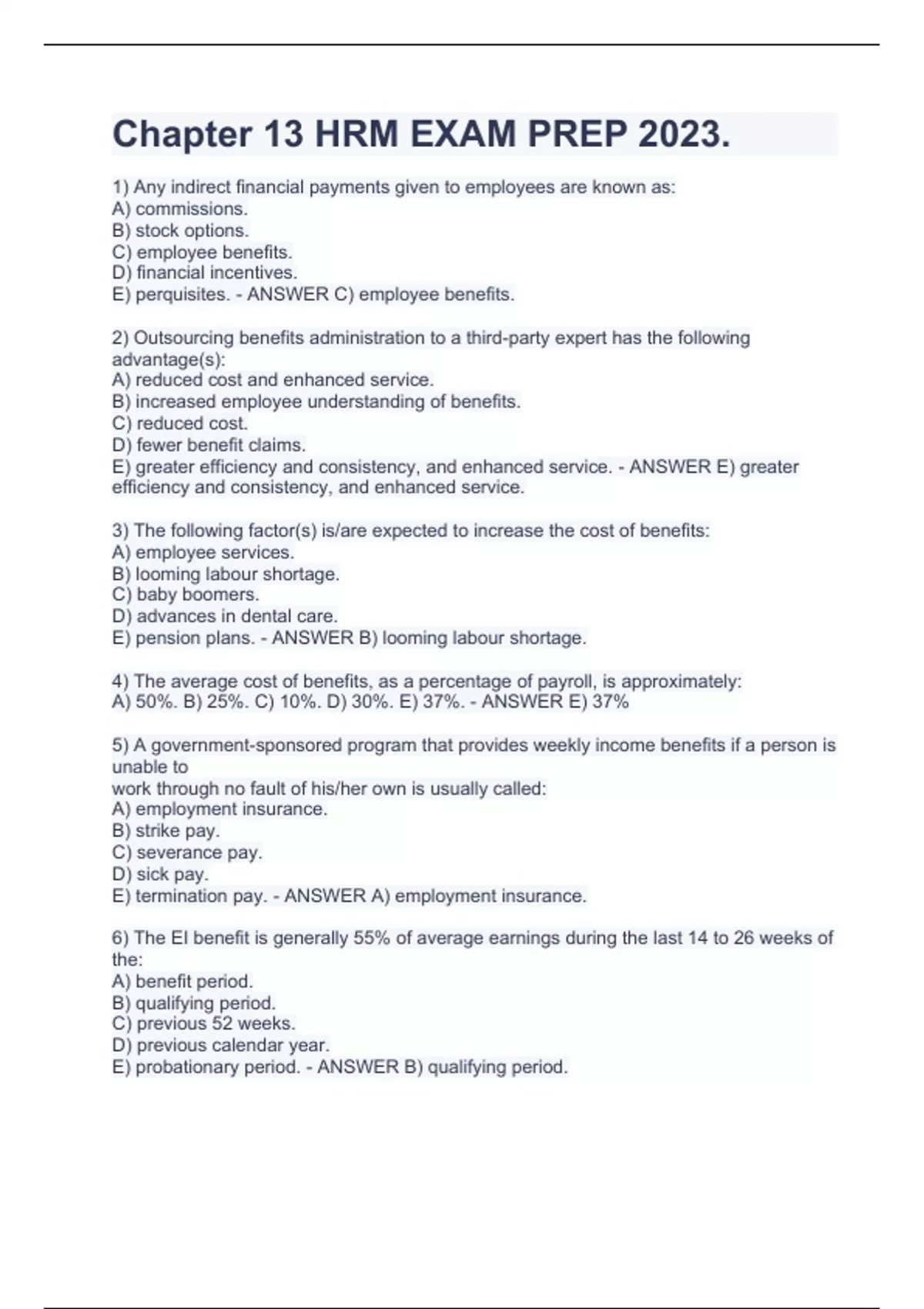 Chapter 13 HRM EXAM PREP 2023. 1) Any indirect financial payments given to employees are known as: A) commissions. B) stock options. C) employee benefits. D) financial incentives. E) perquisites. - ANSWER C) employee benefits. 2) Outsourcing benefits administration to a third-party expert has the following advantage(s): A) reduced cost and enhanced service. B) increased employee understanding of benefits. C) reduced cost. D) fewer benefit claims. E) greater efficiency and consistency, and enhanced service. - ANSWER E) greater efficiency and consistency, and enhanced service. 3) The following factor(s) is/are expected to increase the cost of benefits: A) employee services. B) looming labour shortage. C) baby boomers. D) advances in dental care. E) pension plans. - ANSWER B) looming labour shortage. 4) The average cost of benefits, as a percentage of payroll, is approximately: A) 50%. B) 25%. C) 10%. D) 30%. E) 37%. - ANSWER E) 37% 5) A government-sponsored program that provides weekly income benefits if a person is unable to work through no fault of his/her own is usually called: A) employment insurance. B) strike pay. C) severance pay. D) sick pay. E) termination pay. - ANSWER A) employment insurance. 6) The EI benefit is generally 55% of average earnings during the last 14 to 26 weeks of the: A) benefit period. B) qualifying period. C) previous 52 weeks. D) previous calendar year. E) probationary period. - ANSWER B) qualifying period. 7) The purpose of an SUB plan is: A) to supplement maternity leave. B) to facilitate an agreement between an employer and the employees. C) the result of collective bargaining. D) to supplement EI benefits by receiving a combined benefit closer to the actual working wage. E) to provide benefits separate from EI so that employees can better maintain their standard of living during periods of unemployment. - ANSWER D) to supplement EI benefits by receiving a combined benefit closer to the actual working wage. 8) The three types of benefits provided under the Canada/Quebec Pension Plan are: A) disability, survivor, old age security. B) retirement, disability, survivor. C) retirement, survivor, health care. D) retirement, vacation, disability. E) retirement, survivor, old age security. - ANSWER B) retirement, disability, survivor.
