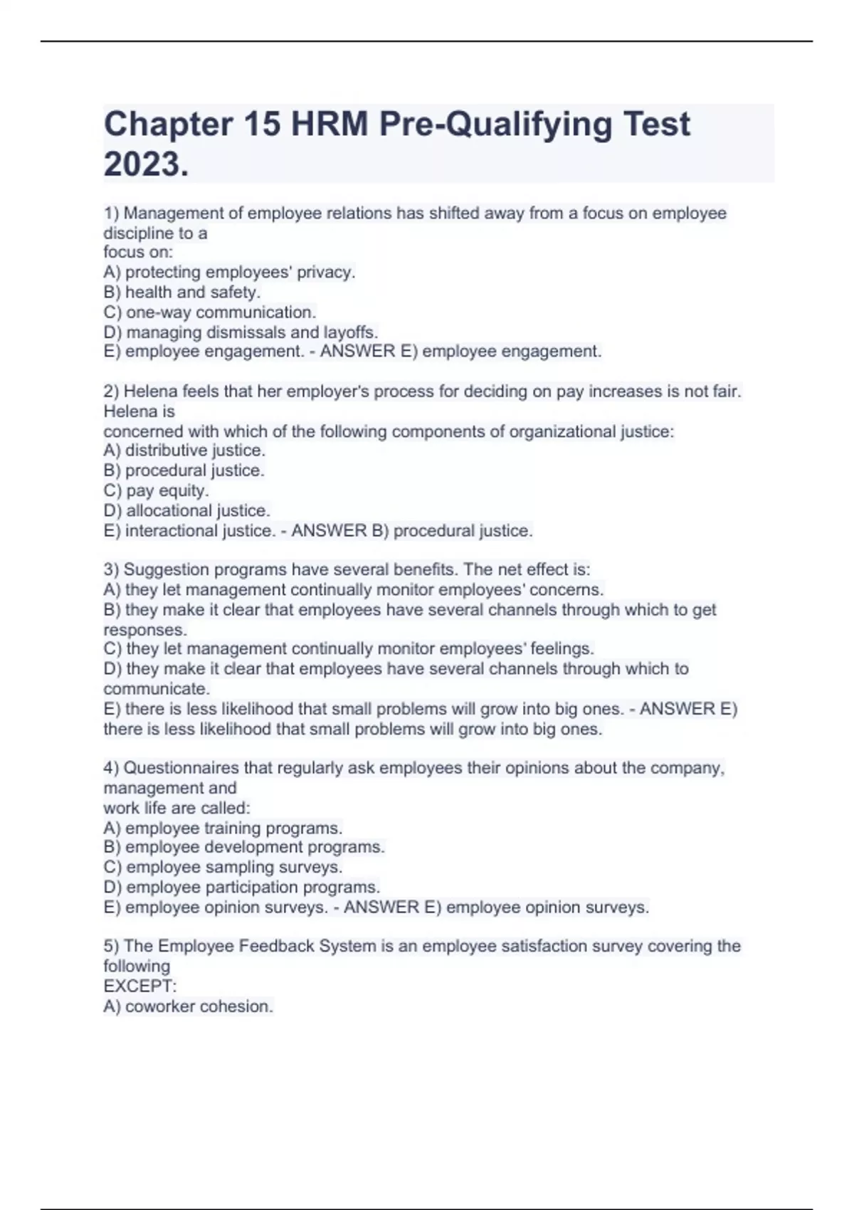 Chapter 15 HRM Pre-Qualifying Test 2023. 1) Management of employee relations has shifted away from a focus on employee discipline to a focus on: A) protecting employeesʹ privacy. B) health and safety. C) one-way communication. D) managing dismissals and layoffs. E) employee engagement. - ANSWER E) employee engagement. 2) Helena feels that her employerʹs process for deciding on pay increases is not fair. Helena is concerned with which of the following components of organizational justice: A) distributive justice. B) procedural justice. C) pay equity. D) allocational justice. E) interactional justice. - ANSWER B) procedural justice. 3) Suggestion programs have several benefits. The net effect is: A) they let management continually monitor employeesʹ concerns. B) they make it clear that employees have several channels through which to get responses. C) they let management continually monitor employeesʹ feelings. D) they make it clear that employees have several channels through which to communicate. E) there is less likelihood that small problems will grow into big ones. - ANSWER E) there is less likelihood that small problems will grow into big ones. 4) Questionnaires that regularly ask employees their opinions about the company, management and work life are called: A) employee training programs. B) employee development programs. C) employee sampling surveys. D) employee participation programs. E) employee opinion surveys. - ANSWER E) employee opinion surveys. 5) The Employee Feedback System is an employee satisfaction survey covering the following EXCEPT: A) coworker cohesion. B) recruitment policies. C) quality focus. D) job satisfaction. E) employee commitment. - ANSWER B) recruitment policies. 6) Traditional employee communication media such as newsletters are being replaced with the following EXCEPT: A) email. B) intranets. C) videos.