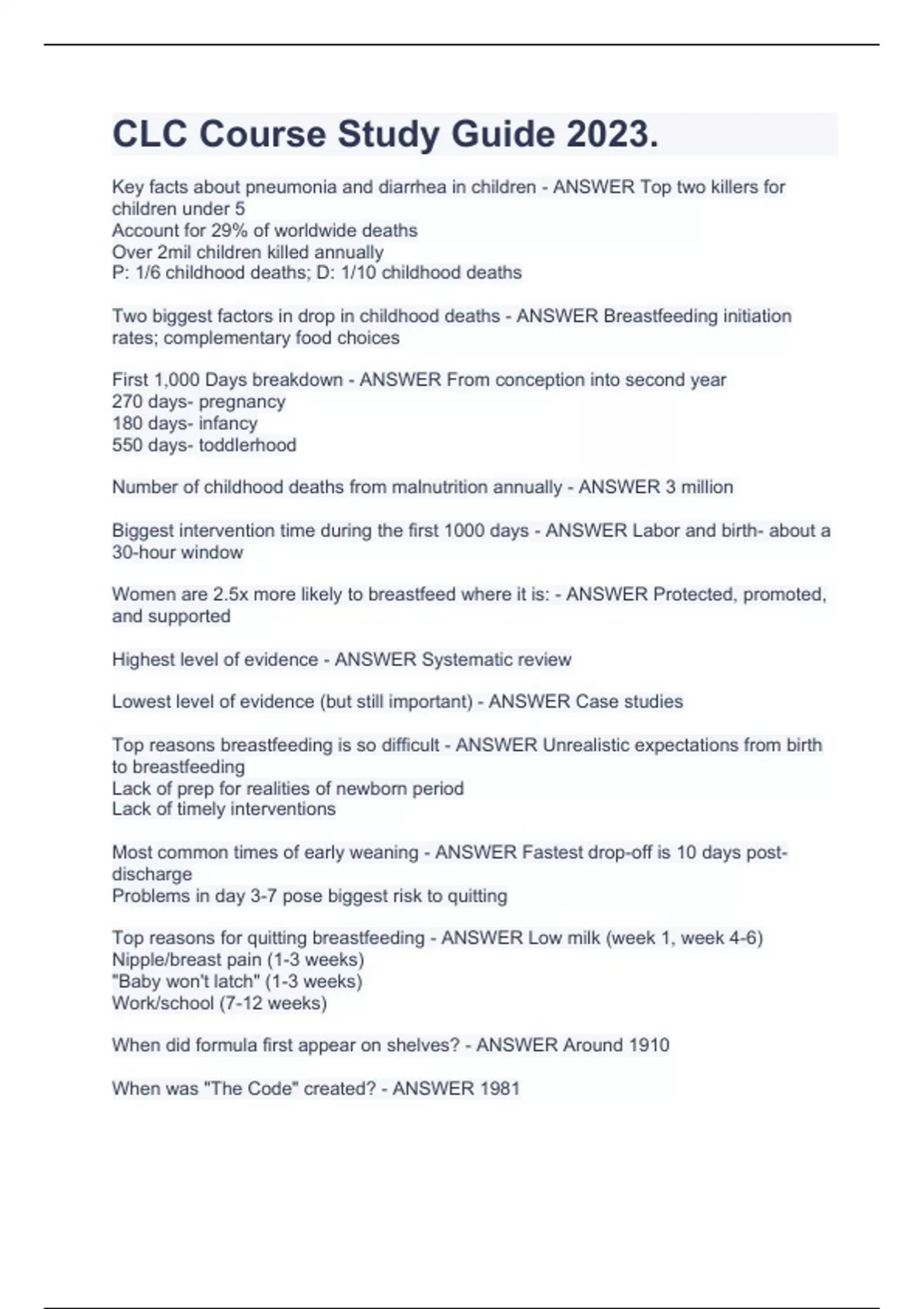 CLC Course Study Guide 2023. Key facts about pneumonia and diarrhea in children - ANSWER Top two killers for children under 5 Account for 29% of worldwide deaths Over 2mil children killed annually P: 1/6 childhood deaths; D: 1/10 childhood deaths Two biggest factors in drop in childhood deaths - ANSWER Breastfeeding initiation rates; complementary food choices First 1,000 Days breakdown - ANSWER From conception into second year 270 days- pregnancy 180 days- infancy 550 days- toddlerhood Number of childhood deaths from malnutrition annually - ANSWER 3 million Biggest intervention time during the first 1000 days - ANSWER Labor and birth- about a 30-hour window Women are 2.5x more likely to breastfeed where it is: - ANSWER Protected, promoted, and supported Highest level of evidence - ANSWER Systematic review Lowest level of evidence (but still important) - ANSWER Case studies Top reasons breastfeeding is so difficult - ANSWER Unrealistic expectations from birth to breastfeeding Lack of prep for realities of newborn period Lack of timely interventions Most common times of early weaning - ANSWER Fastest drop-off is 10 days post-discharge Problems in day 3-7 pose biggest risk to quitting Top reasons for quitting breastfeeding - ANSWER Low milk (week 1, week 4-6) Nipple/breast pain (1-3 weeks) "Baby won't latch" (1-3 weeks) Work/school (7-12 weeks) When did formula first appear on shelves? - ANSWER Around 1910 When was "The Code" created? - ANSWER 1981 What does The Code do? - ANSWER Regulates marketing of formula Sets standards for labeling/quality of products It is voluntary- the US does not abide by it What is the WBTi? - ANSWER The World Breastfeeding Trends Initiative Tracks, assesses, monitors implementation of global strategy EBF rate for under 6mo, globally - ANSWER 42% Causes of low EBF rate globally - ANSWER Beliefs about mixed feedings Lack of hospital/healthcare support Formula promotion Lack of family leave policies Lack of knowledge of dangers of not EBF Lack of knowledge of BF techniques BF initiation trends by decade - ANSWER Lowest rates- early 1970s Increased from early 70s to early 80s Dropped between early 80s to early 90s Increased again in 1990s