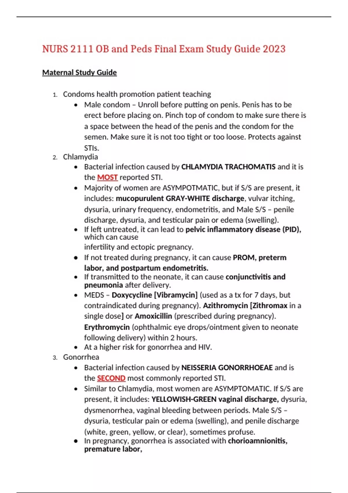 NURS 2111 OB and Peds Final Exam Study Guide 2023 Maternal Study Guide 1. Condoms health promotion patient teaching • Male condom – Unroll before putting on penis. Penis has to be erect before placing on. Pinch top of condom to make sure there is a space between the head of the penis and the condom for the semen. Make sure it is not too tight or too loose. Protects against STIs. 2. Chlamydia • Bacterial infection caused by CHLAMYDIA TRACHOMATIS and it is the MOST reported STI. • Majority of women are ASYMPOTMATIC, but if S/S are present, it includes: mucopurulent GRAY-WHITE discharge, vulvar itching, dysuria, urinary frequency, endometritis, and Male S/S – penile discharge, dysuria, and testicular pain or edema (swelling). • If left untreated, it can lead to pelvic inflammatory disease (PID), which can cause infertility and ectopic pregnancy. • If not treated during pregnancy, it can cause PROM, preterm labor, and postpartum endometritis. • If transmitted to the neonate, it can cause conjunctivitis and pneumonia after delivery. • MEDS – Doxycycline [Vibramycin] (used as a tx for 7 days, but contraindicated during pregnancy). Azithromycin [Zithromax in a single dose] or Amoxicillin (prescribed during pregnancy). Erythromycin (ophthalmic eye drops/ointment given to neonate following delivery) within 2 hours. • At a higher risk for gonorrhea and HIV. 3. Gonorrhea • Bacterial infection caused by NEISSERIA GONORRHOEAE and is the SECOND most commonly reported STI. • Similar to Chlamydia, most women are ASYMPTOMATIC. If S/S are present, it includes: YELLOWISH-GREEN vaginal discharge, dysuria, dysmenorrhea, vaginal bleeding between periods. Male S/S – dysuria, testicular pain or edema (swelling), and penile discharge (white, green, yellow, or clear), sometimes profuse. • In pregnancy, gonorrhea is associated with chorioamnionitis, premature labor, spontaneous abortion, PROM, and postpartum endometritis. • If transmitted to the neonate, ophthalmia neonatorum occurs which can lead to blindness; hence, the importance of ERYTHROMYCIN. • Meds - 4. Syphilis • Caused by a spirochete bacterium TREPONEMA PALLIDUM. • Primarily affects Blacks, Hispanics, and racial/ethnic minority groups. • Has 5 stages: Primary, Secondary, Early Latency, Late Latency, and Tertiary (LATE). - Primary A chancre (painless ulcer) at the site of bacterial entry that will disappear within 3 to 6 weeks without intervention. This period is highly contagious especially whenever chancres are present. - Secondary Appears 2 to 6 months after initial exposure and is manifested by flu-like symptoms and a maculopapular rash of the trunk, palms, and soles. Alopecia and adenopathy are both common during this stage. Lasts about 2 years. - Early/Late Latency (Hidden Stages) Characterized by the absence of any clinical manifestations of disease, though the serology is positive. This stage can last as long as 20 years. - Tertiary (Late) Damage to internal organs occurs. • Meds – Penicillin G in a single dose. Doxycycline or tetracycline orally, if allergic to penicillin. Do not administer if pregnant. • If left untreated or undiagnosed, can be transmitted to the neonate and cause stillborn birth or congenital abnormalities. 5. Trichomoniasis • Caused by a protozoan parasite called TRICHOMONAS VAGINALIS. • Can be sexually transmitted OR can be transmitted from wet surfaces like a hot tub. • S/S in women: FROTHY, GREENISH-YELLOW, FOUL SMELLING DISCHARGE and vulvar itching, edema, and redness. Men are asymptomatic. • Although this infection is localized, there is increasing evidence of preterm birth, premature rupture of membranes, low-birth-weight infants, postpartum endometritis, and infertility in women with this type of vaginitis. • Meds - A single 2-g dose of oral metronidazole (Flagyl) or tinidazole (Tindamax) for both partners is a common treatment for this infection. Metronidazole is not given during the first trimester of pregnancy due to the teratogenic effects on the fetus. 6. IUD • Active T-shaped device inserted through the cervix and placed in the uterus. Most effective contraceptive methods. • Must be monitored monthly by clients after menstruation to ensure the presence of the small string that hangs from the device into the upper part of the vagina to rule out migration or expulsion of the device. • Advantage: IUD can maintain effectiveness for 3 to 10 years (hormonal IUD 3 to 5 years; copper IUD 10 years) • Disadvantage: This method can increase the risk of pelvic inflammatory disease, uterine perforation, or ectopic pregnancy and can be expelled. • Warnings for Potential Complications for Intrauterine System Users: P = Period late, pregnancy, abnormal spotting or bleeding A = Abdominal pain, pain with intercourse I = Infection exposure, abnormal vaginal discharge N = Not feeling well, fever, chills S = String length shorter or longer or missing • Contraindications: Active pelvic infection, abnormal uterine bleeding, and severe uterine distortion • Complications – bacterial vaginosis which can lead to PID. • No douching when IUD because it pushes the bacteria up and it’ll get trapped in the IUD. 7. Pelvic inflammatory disease • An infectious condition of the pelvic cavity that may involve the fallopian tubes, ovaries, and peritoneum. • Major cause of female infertility • Higher in young adolescent girls and young adults • S/S – lower abdominal pain, spotting after intercourse, fever and chills, irregular bleeding • Complications – fibrosis, scarring, loss of tubal function, ectopic pregnancy, pelvic abscess, infertility, recurrent or chronic episodes, chronic abd pain, pelvic adhesions, and depression 8. Infertility • Primary: Defined as an inability to conceive despite engaging in unprotected sexual intercourse for at least 12 months. • Secondary: You have a child and now unable to get pregnant after that child. • RF: overweight or u