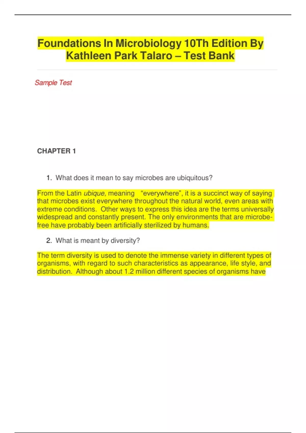 Foundations In Microbiology 10Th Edition By Kathleen Park Talaro – Test Bank Sample Test CHAPTER 1 1. What does it mean to say microbes are ubiquitous? From the Latin ubique, meaning “everywhere”, it is a succinct way of saying that microbes exist everywhere throughout the natural world, even areas with extreme conditions. Other ways to express this idea are the terms universally widespread and constantly present. The only environments that are microbe- free have probably been artificially sterilized by humans. 2. What is meant by diversity? The term diversity is used to denote the immense variety in different types of organisms, with regard to such characteristics as appearance, life style, and distribution. Although about 1.2 million different species of organisms have been discovered and named, this is only a small fraction of the true diversity present over the entire planet and its millions of habitats. The case study emphasizes that we are still at the early stages in exploring the richness of life (especially of the microbial type) that is hidden and largely unknown because of small size and inaccessiblity. 3. Most important events and discoveries: Many hundreds of separate scientists and labs contributed to the rise of microbiology during its early history. Tools such as the microscope allowed direct observation of samples and their microbial contents. Microbes were subsequently seen as discrete entities that could be observed, described, and documented much like larger organisms. Development of laboratory techniques for culturing microbes using sterile techniques allowed macroscopic handling and control of microbes so they could be studied and understood in greater depth. Application of the scientific method and experiments to standardize the requirements for fact-based inquiries were very important. The abandonment of the spontaneous generation theory was especially significant because it departed from superstition and prejudice in favor of the scientific method. The institution of the germ theory of disease and the development of aseptic techniques were an essential contribution to medical aspects of microbiology. The knowledge that microbes cause food spoilage and disease led to early attempts to control microbes using heat and other methods. 4. Use of the scientific method: A hypothesis is a statement put forth by an investigator that purports to explain a phenomenon based upon a collection of observations, tests, and other objective criteria. It can be tested experimentally. A theory is a statement of confidence that scientifically-based observations provide a factual explanation for some natural phenomenon. It is supported by measurable data collected from numerous experiments used to test the hypothesis. Examples: For years, it was not really known what was the exact cause of tooth decay. Various hypotheses were proposed that acid, sugar, tooth hygiene, and other factors were involved. Finally, after having the correct conditions for experimentation (on animals that lacked normal resident microbes), it was determined that a combination of excess dietary sugar, lack of cleaning, and certain streptococci living in the mouth were the primary factors. Likewise, the germ theory of disease started out as a hypothesis, but after thorough verification, it became not only a theory, but is now considered a law because it has held true over several centuries of investigation. 5. Classification of microbes Evolution is a process by which organisms gradually change (evolve) over long periods of time through inheritance of modified characteristics from ancestors. It asserts that all organisms arise from preexisting forms and that this relatedness shows itself by similarities in structure, physiology, and genetics. Biologists and microbiologists use various means to show the pattern of evolution, including trees, taxonomy, classification, and nomenclature. Taxonomy is a hierarchical system, from general to specific, for assembling organisms into a scheme that emphasizes their origins and relatedness. Classification is the process of collecting organisms into distinct taxonomic groups according to defined characteristics. Nomenclature is the naming of these categories in collaboration with their level of classification. Most classification schemes are based on evolutionary relatedness, with organisms that are more closely related placed in the same taxonomic groups. The correct order of taxa, from broadest and most inclusive to most specific, is: Domain, Kingdom, Phylum, Class, Order, Family, Genus, and Species. The five Kingdom system groups the archaea with the bacteria in the prokaryotic category. In comparison the domain system emphasizes the evolutionary separation of the Archaea from the Bacteria and their early relatedness with the Eukarya. The binomial system of nomenclature assigns a genus and species (scientific) name to each organism; the first letter of the genus is capitalized, the species is lowercase, and the two names are underlined or italicized. This system standardizes naming and ensures consistency and universality. Names may also provide an indication of noteworthy characteristics of the organisms or its discoverer.
