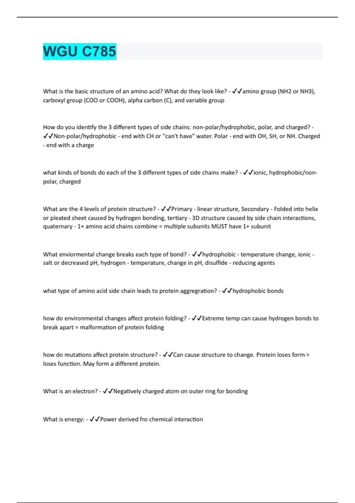 What is the basic structure of an amino acid? What do they look like? - amino group (NH2 or NH3), carboxyl group (COO or COOH), alpha carbon (C), and variable group How do you identify the 3 different types of side chains: non-polar/hydrophobic, polar, and charged? - Non-polar/hydrophobic - end with CH or "can't have" water. Polar - end with OH, SH, or NH. Charged - end with a charge what kinds of bonds do each of the 3 different types of side chains make? - ionic, hydrophobic/nonpolar, charged What are the 4 levels of protein structure? - Primary - linear structure, Secondary - Folded into helix or pleated sheet caused by hydrogen bonding, tertiary - 3D structure caused by side chain interactions, quaternary - 1+ amino acid chains combine = multiple subunits MUST have 1+ subunit What enviormental change breaks each type of bond? - hydrophobic - temperature change, ionic - salt or decreased pH, hydrogen - temperature, change in pH, disulfide - reducing agents what type of amino acid side chain leads to protein aggregration? - hydrophobic bonds how do environmental changes affect protein folding? - Extreme temp can cause hydrogen bonds to break apart = malformation of protein folding how do mutations affect protein structure? - Can cause structure to change. Protein loses form = loses function. May form a different protein. What is an electron? - Negatively charged atom on outer ring for bonding What is energy: - Power derived fro chemical interaction