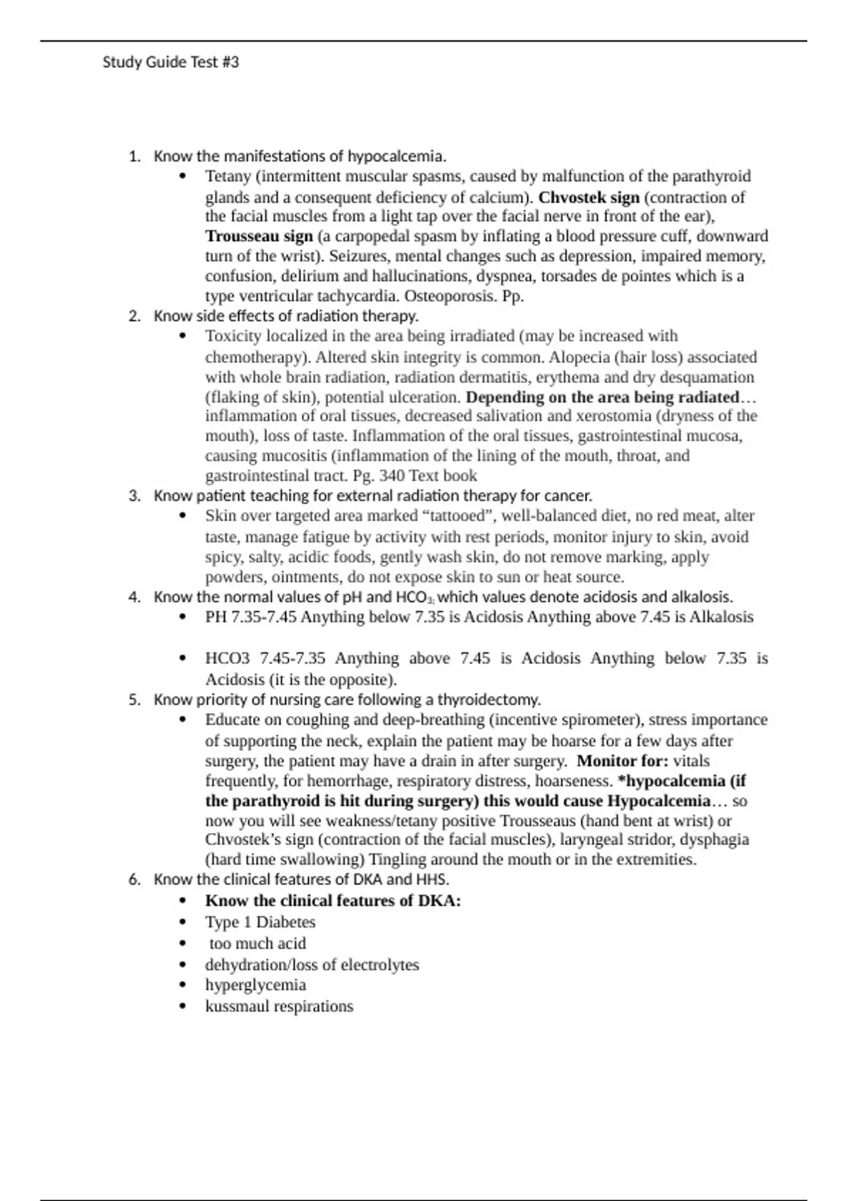 1. Know the manifestations of hypocalcemia. Tetany (intermittent muscular spasms, caused by malfunction of the parathyroid glands and a consequent deficiency of calcium). Chvostek sign (contraction of the facial muscles from a light tap over the facial nerve in front of the ear), Trousseau sign (a carpopedal spasm by inflating a blood pressure cuff, downward turn of the wrist). Seizures, mental changes such as depression, impaired memory, confusion, delirium and hallucinations, dyspnea, torsades de pointes which is a type ventricular tachycardia. Osteoporosis. Pp. 2. Know side effects of radiation therapy. Toxicity localized in the area being irradiated (may be increased with chemotherapy). Altered skin integrity is common. Alopecia (hair loss) associated with whole brain radiation, radiation dermatitis, erythema and dry desquamation (flaking of skin), potential ulceration. Depending on the area being radiated… inflammation of oral tissues, decreased salivation and xerostomia (dryness of the mouth), loss of taste. Inflammation of the oral tissues, gastrointestinal mucosa, causing mucositis (inflammation of the lining of the mouth, throat, and gastrointestinal tract. Pg. 340 Text book 3. Know patient teaching for external radiation therapy for cancer. Skin over targeted area marked “tattooed”, well-balanced diet, no red meat, alter taste, manage fatigue by activity with rest periods, monitor injury to skin, avoid spicy, salty, acidic foods, gently wash skin, do not remove marking, apply powders, ointments, do not expose skin to sun or heat source. 4. Know the normal values of pH and HCO3; which values denote acidosis and alkalosis. PH 7.35-7.45 Anything below 7.35 is Acidosis Anything above 7.45 is Alkalosis HCO3 7.45-7.35 Anything above 7.45 is Acidosis Anything below 7.35 is Acidosis (it is the opposite). 5. Know priority of nursing care following a thyroidectomy. Educate on coughing and deep-breathing (incentive spirometer), stress importance of supporting the neck, explain the patient may be hoarse for a few days after surgery, the patient may have a drain in after surgery. Monitor for: vitals frequently, for hemorrhage, respiratory distress, hoarseness. *hypocalcemia (if the parathyroid is hit during surgery) this would cause Hypocalcemia… so now you will see weakness/tetany positive Trousseaus (hand bent at wrist) or Chvostek’s sign (contraction of the facial muscles), laryngeal stridor, dysphagia (hard time swallowing) Tingling around the mouth or in the extremities. 6. Know the clinical features of DKA and HHS. Know the clinical features of DKA: Type 1 Diabetes too much acid dehydration/loss of electrolytes hyperglycemia kussmaul respirations