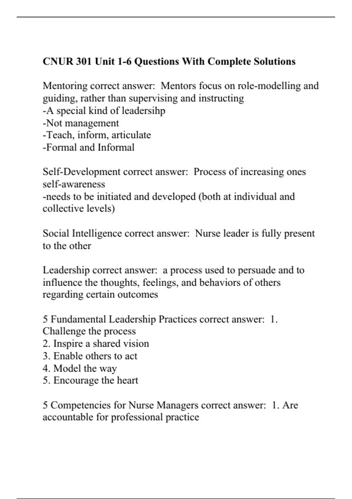 Mentoring correct answer: Mentors focus on role-modelling and guiding, rather than supervising and instructing -A special kind of leadersihp -Not management -Teach, inform, articulate -Formal and Informal Self-Development correct answer: Process of increasing ones self-awareness -needs to be initiated and developed (both at individual and collective levels) Social Intelligence correct answer: Nurse leader is fully present to the other Leadership correct answer: a process used to persuade and to influence the thoughts, feelings, and behaviors of others regarding certain outcomes 5 Fundamental Leadership Practices correct answer: 1. Challenge the process 2. Inspire a shared vision 3. Enable others to act 4. Model the way 5. Encourage the heart 5 Competencies for Nurse Managers correct answer: 1. Are accountable for professional practice 2. Communicate well verbally