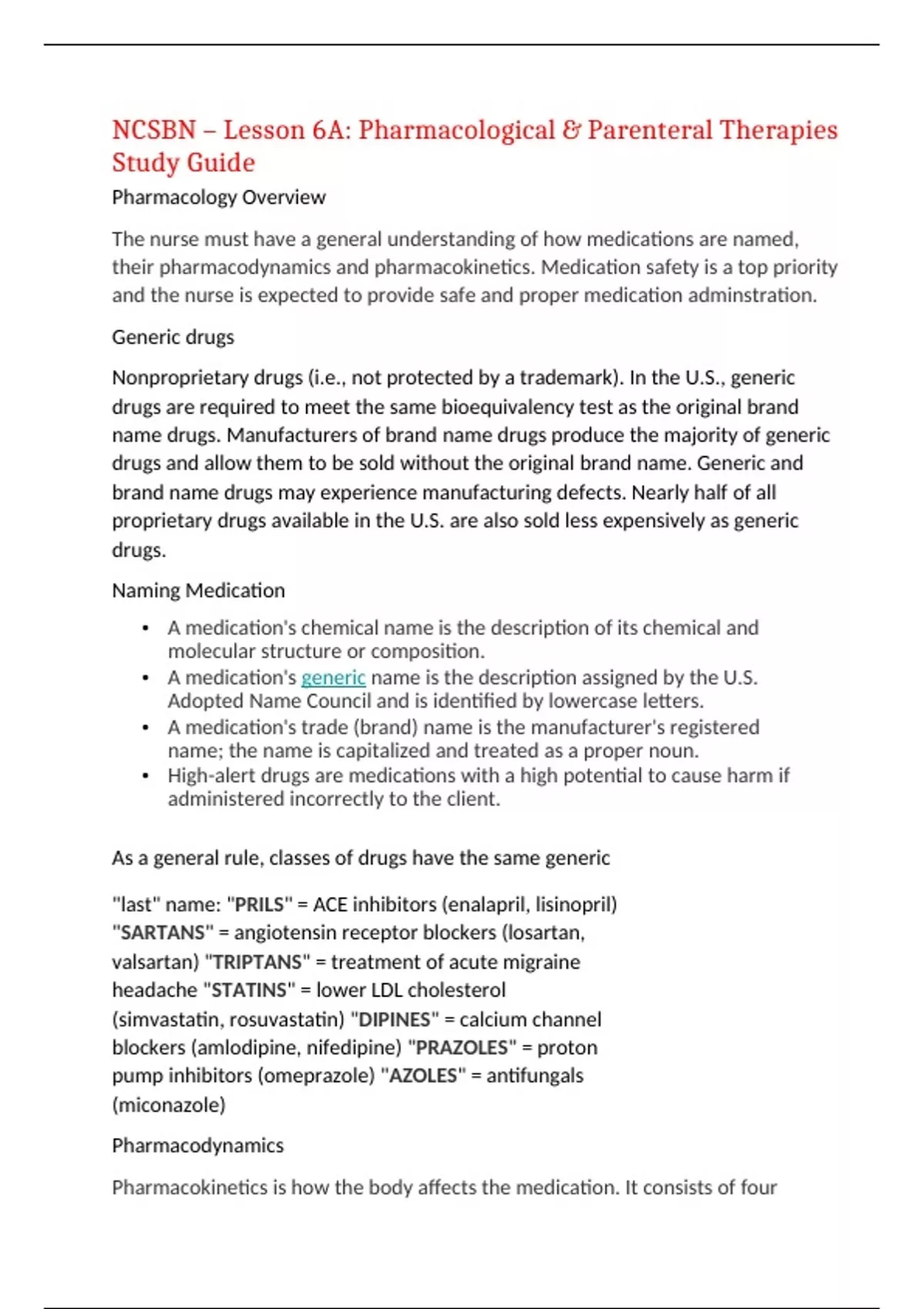 NCSBN – Lesson 6A: Pharmacological & Parenteral Therapies Study Guide Pharmacology Overview The nurse must have a general understanding of how medications are named, their pharmacodynamics and pharmacokinetics. Medication safety is a top priority and the nurse is expected to provide safe and proper medication adminstration. Generic drugs Nonproprietary drugs (i.e., not protected by a trademark). In the U.S., generic drugs are required to meet the same bioequivalency test as the original brand name drugs. Manufacturers of brand name drugs produce the majority of generic drugs and allow them to be sold without the original brand name. Generic and brand name drugs may experience manufacturing defects. Nearly half of all proprietary drugs available in the U.S. are also sold less expensively as generic drugs. Naming Medication • A medication's chemical name is the description of its chemical and molecular structure or composition. • A medication's generic name is the description assigned by the U.S. Adopted Name Council and is identified by lowercase letters. • A medication's trade (brand) name is the manufacturer's registered name; the name is capitalized and treated as a proper noun. • High-alert drugs are medications with a high potential to cause harm if administered incorrectly to the client. As a general rule, classes of drugs have the same generic "last" name: "PRILS" = ACE inhibitors (enalapril, lisinopril) "SARTANS" = angiotensin receptor blockers (losartan, valsartan) "TRIPTANS" = treatment of acute migraine headache "STATINS" = lower LDL cholesterol (simvastatin, rosuvastatin) "DIPINES" = calcium channel blockers (amlodipine, nifedipine) "PRAZOLES" = proton pump inhibitors (omeprazole) "AZOLES" = antifungals (miconazole) Pharmacodynamics Pharmacokinetics is how the body affects the medication. It consists of four processes: absorption, distribution, biotransformation (metabolism) and excretion. The factors affecting pharmacokinetics include a client's body mass index or growth and development factors, and drug-related factors such as the medication's route and administration, therapeutic ranges and side effects or tolerances. Medication Safety Nurses are responsible for providing safe, quality care in every patient setting. The complexity of the health care environment can contribute to prospective errors. Medication-related errors are the most common type of error and also help account for the increase in health care costs. Medication errors are responsible for over 7000 deaths annually (IOM, 2000). 10 Rights of Medication Administration The ten rights of medication administration • Right dose: o Check the medication's label against the client's administration record. • Right time: o Check the health care organization's policies for the right time to administer the drug (30 minutes before or 30 minutes after the ordered time is usually acceptable). • Right route: o Check the medication order to verify that the route is specified. • Right drug: o Check speed of infusion or push. o Verify accurate dosage calculations. • Right client: o Check the client's ID bracelet and verify the name and birth date; where available, include a bar code check of the ID bracelet. o Have the client state full name and birth date. o Verify information using the medication administration report (MAR). • Right documentation: o Immediately after giving the medication, the nurse will document on the MAR or electronic medical record (EMR), including the drug name, time, dose, route and signature. • Right assessment: o If necessary, the nurse must assess vital signs and check client data, such as lab values or other diagnostic studies before administrating medication. If the client needs to swallow their medication, the nurse must also assess the client's ability to do so. • Right education: o The client should be taught the indication for and maintenance of current medications. • Right evaluation: o Assess the client's response to an intervention. • Right to refuse medication: o The client has a right to refuse medication. The nurse must explore the client's reasoning for refusing the medication and then should explain complications associated with not taking the medication. Finally, the nurse must document the incident and notify the client's health care provider. Times to Double-check a Medication • When first taking the medication out of the container • Just before opening the medication package or pouring the dose • Just before replacing the container in the storage area or giving a unit dose to the client Medication Errors • Medication errors are often a result of poor communication. The most common nursing medication errors include administering the wrong dose, giving the medication at the wrong time or by the wrong route, and administering medications to the incorrect client. • Prescribing errors include mistakes made by the provider in prescribing drugs. This involves unsuitable drug choices, dosing errors, incompatibilities and contraindications. Preventing Medication Errors There are several steps you can follow to decrease medication errors. First, perform a medication reconciliation and avoid distractions while compiling the client's medications. Next, thoroughly check the Ten Rights of Medication Administration. Be sure to review the client's data and diagnostic tests prior to administration. Finally, read the medication labels three separate times and verify any medication allergies and contradictions. Use the acronym P.I.N.C.H. to remember some of the more commonly administered high alert medications. P = Potassium I = Insulin N = Narcotics C = Chemotherapy H = Heparin Client Teaching for All Prescribed Medications The nurse must discuss and verify the client's understanding of all drug information including the drug's name, dose, indication, administration guidelines, storage and adverse reactions (A harmful and undesired reaction resulting from the us