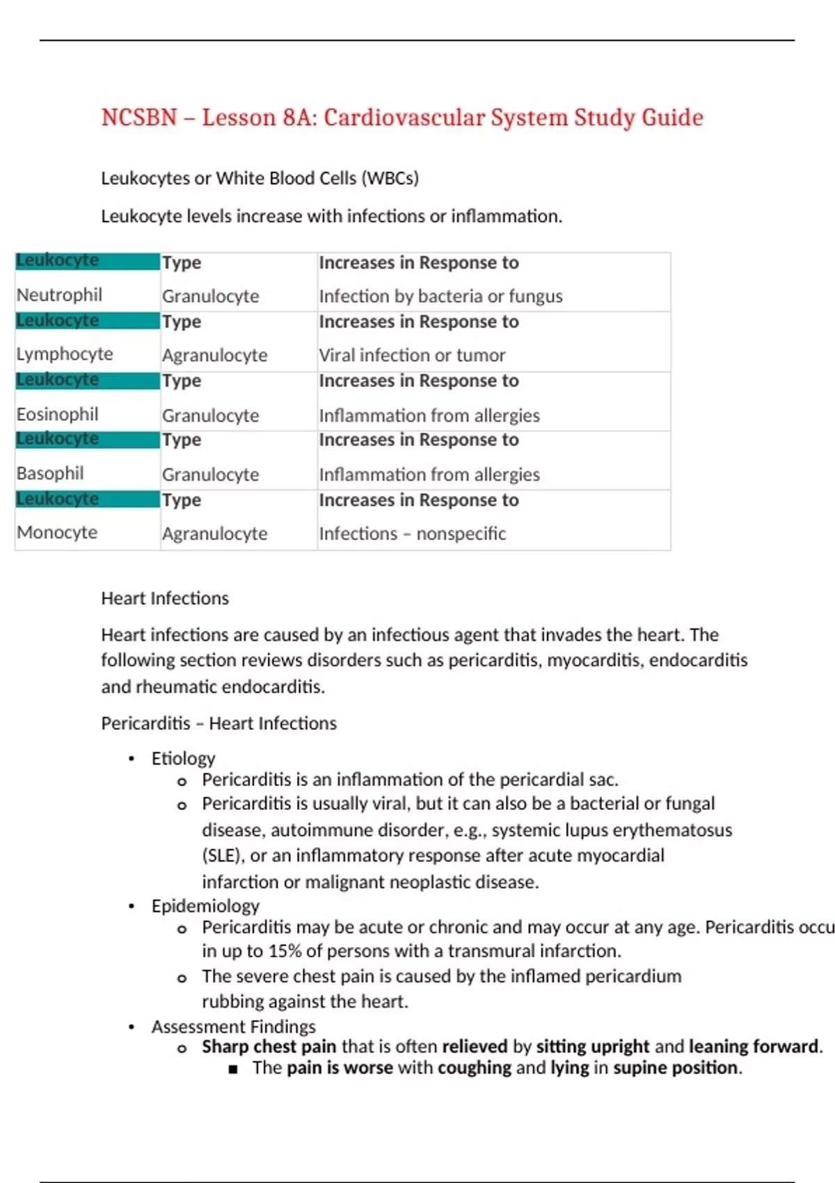 NCSBN – Lesson 8A: Cardiovascular System Study Guide Leukocytes or White Blood Cells (WBCs) Leukocyte levels increase with infections or inflammation. Leukocyte Type Granulocyte Increases in Response to Infection by bacteria or fungus Neutrophil Leukocyte Type Agranulocyte Increases in Response to Viral infection or tumor Lymphocyte Leukocyte Type Granulocyte Increases in Response to Inflammation from allergies Eosinophil Leukocyte Type Granulocyte Increases in Response to Inflammation from allergies Basophil Leukocyte Type Agranulocyte Increases in Response to Infections – nonspecific Monocyte Heart Infections Heart infections are caused by an infectious agent that invades the heart. The following section reviews disorders such as pericarditis, myocarditis, endocarditis and rheumatic endocarditis. Pericarditis – Heart Infections • Etiology o Pericarditis is an inflammation of the pericardial sac. o Pericarditis is usually viral, but it can also be a bacterial or fungal disease, autoimmune disorder, e.g., systemic lupus erythematosus (SLE), or an inflammatory response after acute myocardial infarction or malignant neoplastic disease. • Epidemiology o Pericarditis may be acute or chronic and may occur at any age. Pericarditis occurs in up to 15% of persons with a transmural infarction. o The severe chest pain is caused by the inflamed pericardium rubbing against the heart. • Assessment Findings o Sharp chest pain that is often relieved by sitting upright and leaning forward. ▪ The pain is worse with coughing and lying in supine position. ▪ The client cannot lie flat without severe chest pain or SOB o Other findings include fever, sweating, chills (with infectious causes) and dysrhythmia. o Pulsus paradoxus (fall in systolic BP with inspiration > 10 mm Hg) will be seen as well. o Scratchy, grating or squeaking sound o Listen using the bell of stethoscope over the left lateral sternal border to hear one systolic sound and two diastolic sounds • Diagnostic Studies o A history and physical exam will be performed as well as serum studies: ▪ Increase in WBC (with infectious causes) ▪ Increased sedimentation rate (marker for inflammation) • Positive blood cultures if infection is present • Positive antinuclear antibody (ANA) if due to connective tissue (autoimmune) disease o There will be widespread echocardiograph (ECG) changes in the ST segment. o An EEG will be ordered to determine if there is a pericardial effusion or cardiac tamponade. • Management o Pharmacological: ▪ Anti-inflammatory medications: NSAIDS, corticosteroids to treat inflammation and pain ▪ Antibiotics if caused by an infection ▪ Avoid anticoagulants – may increase the possibility of cardiac tamponade from bleeding risk ▪ Oxygen if hypoxia is present o Surgical intervention may be necessary. o An emergency pericardiocentesis will be performed if cardiac tamponade develops. o For recurrent constrictive pericarditis; a partial pericardiectomy (pericardial window) or total pericardiectomy will be performed. • Nursing Interventions o The nurse will manage the client's pain and anxiety. o Position the client in a semi-Fowler's or high-Fowler's position for comfort. o Administer analgesics as ordered to keep pain at 0-2 (on a scale of 1-10). ▪ Also, administer medications as ordered to treat the cause. o Assess respiratory, cardiovascular and renal status every 1-2 hours in the acute phase. ▪ Monitor for pericarditis complications such as dysrhythmias, cardiac tamponade and heart failure. o Be sure to have a pericardiocentesis set at the client's bedside in case of cardiac tamponade. Teach the client and family the Cardio Five. ▪ Cardio 5 Teaching Plan TDD DS Topic Tests and Treatments Nursing Action Explain tests and treatments in simple, culturally sensitive ways T TDD DS Topic Drugs Nursing Action Write out names and explain the reason for medications, their side effects and how long the client will take them D TDD DS Topic Diet Nursing Action Good nutrition and restrictions, i.e., low sodium, whole grains, a variety of fruits and vegetables (DASH diet) D TDD DS Topic Disease Nursing Action Explanation of the disorder and treatment plan D TDD DS Topic Smoker? Nursing Action Encourage to stop smoking S Myocarditis – Heart Infections Myocarditis is an inflammatory condition of the myocardium which can be caused by a viral, bacterial or fungal infection, serum sickness, rheumatic fever, chemical agent or a complication of collagen disease like SLE. • Etiology o Myocarditis is usually an acute and self-limited virus, but it may lead to acute or chronic heart failure and can occur at any age. • Assessment Findings o The assessment findings will depend on the type of infection, degree of myocardial damage, and the capacity of the myocardium to recover and host resistance. ▪ May be minor or unnoticed, i.e., fatigue and dyspnea, palpitations, occasional precordial discomfort manifested as a mild chest soreness and persistent fever ▪ History of recent upper respiratory infection with fever, viral pharyngitis or tonsillitis ▪ Fatigue and dyspnea ▪ Possible signs of congestive heart failure include peripheral edema, weight gain and crackles in lungs ▪ Tachycardia disproportionate to the degree of fever ▪ Joint pain or swelling o Heart Sounds ▪ Systolic • Aortic stenosis - mild o Loud murmur early in systole (musical murmur) o Caused by turbulent blood flow into the aorta o Listen using the diaphragm of the stethoscope with the client in a supine position ▪ Diastolic • Aortic regurgitation - mild o Caused by a bicuspid (thickened) aortic valve o Listen using the diaphragm of the stethoscope over Erb’s point with the client in a sitting position, leaning forward • Mitral stenosis - mild o Commonly due to rheumatic heart disease o Listen using the bell of the stethoscope over the mitral valve, with the client in a left lateral position ▪ The first heart sound is inc