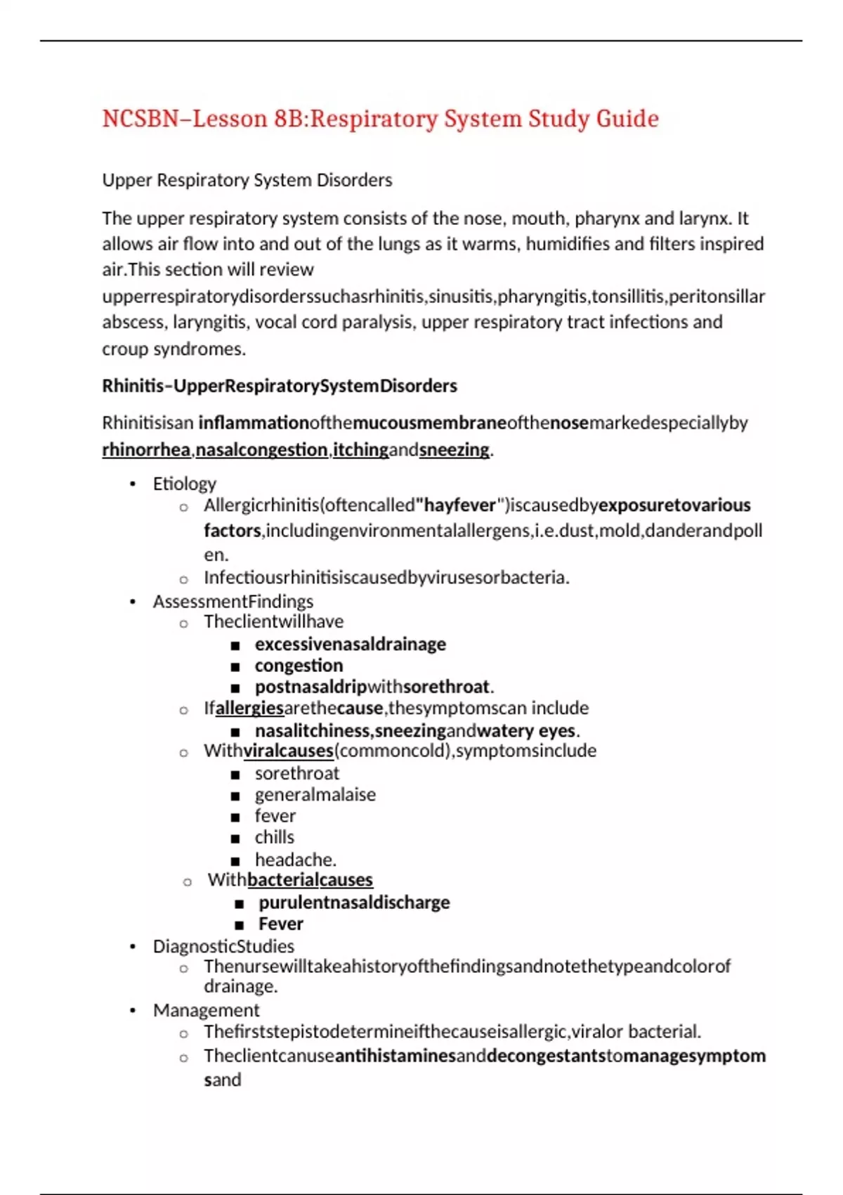 NCSBN–Lesson 8B:Respiratory System Study Guide Upper Respiratory System Disorders The upper respiratory system consists of the nose, mouth, pharynx and larynx. It allows air flow into and out of the lungs as it warms, humidifies and filters inspired air.This section will review upperrespiratorydisorderssuchasrhinitis,sinusitis,pharyngitis,tonsillitis,peritonsillarabscess, laryngitis, vocal cord paralysis, upper respiratory tract infections and croup syndromes. Rhinitis–UpperRespiratorySystemDisorders Rhinitisisan inflammationofthemucousmembraneofthenosemarkedespeciallyby rhinorrhea,nasalcongestion,itchingandsneezing. • Etiology o Allergicrhinitis(oftencalled"hayfever")iscausedbyexposuretovarious factors,includingenvironmentalallergens,,mold,danderandpollen. o Infectiousrhinitisiscausedbyvirusesorbacteria. • AssessmentFindings o Theclientwillhave ▪ excessivenasaldrainage ▪ congestion ▪ postnasaldripwithsorethroat. o Ifallergiesarethecause,thesymptomscan include ▪ nasalitchiness,sneezingandwatery eyes. o Withviralcauses(commoncold),symptomsinclude ▪ sorethroat ▪ generalmalaise ▪ fever ▪ chills ▪ headache. o Withbacterialcauses ▪ purulentnasaldischarge ▪ Fever • DiagnosticStudies o Thenursewilltakeahistoryofthefindingsandnotethetypeandcolorof drainage. • Management o Thefirststepistodetermineifthecauseisallergic,viralor bacterial. o Theclientcanuseantihistaminesanddecongestantstomanagesymptomsand NSAIDsiftheyhaveaheadache. o Ifthecauseisbacterial,anti-infectivesmaybeprescribed. o Ifthecauseisanallergy,clientsshouldeliminatetheirexposuretotheallergic causes and use desensitization immunizations or treatments. o Intheeventofbothviralorbacterialcauses,encouragefluidintake, rest, gargling with salt water and increased intake of vitamin C and zinc. • NursingInterventions o Administertheprescribedmedicationsforreliefandeducatetheclientabouthow toreduceallergens,propermedicationadministrationandgoodhand-washing technique. Sinusitis–UpperRespiratorySystemDisorders Sinusitisistheinflammationofoneormoreoftheparanasal sinuses. ▪ Etiology o Sinusitiscanbecaused byavirusorbacteria. o Toothinfections,allergicrhinitis,sniffingaerosols/powdersandswimming underwater can often lead to sinusitis. o Structuraldefectsofthenosemayalsocausesinusitis. ▪ AssessmentFindings o Clientswillcomplainofa: ▪ frontalheadache ▪ tendernessovertheaffectedsinus(es),especiallywhenpalpatedorpercussed ▪ purulentnasaldrainageandcongestion. ▪ Theymayalsocomplainoftoothpain,generalmalaiseandfever. ▪ DiagnosticStudies o ChronicsuffersmayrequireanX-rayorCTtoevaluatethefluidbuildupin sinusesandmucousmembrane swelling. ▪ Management o Pharmacologicinterventionsmayinclude: ▪ Nasalsaline,decongestantsandnasalcorticosteroids ▪ Mucolytics,antihistamines,analgesics,antipyreticsandantibiotics o Sinusirrigationcanhelpclearandopensinuscavities. o Clientswithchronicsinusitismaybecandidatesforsurgerytodrainandopenthe sinuses. ▪ NursingInterventions o Administer(andteach)clientsabouttakingprescribedmedicationsand encouragefluidintake(atleastsixtoeight8ounceglassesofnon-carbonated, non-alcoholic beverages daily). o Nasalcleaningtechniquesincludehotshowers,steaminhalationornasal irrigation with saline spray, followed by nose blowing. o Performnasalirrigationasneeded. Pharyngitis–UpperRespiratorySystemDisorders - Pharyngitisisaninflammationofthemucousmembranesof the pharynx. ▪ Etiology o Pharyngitiscanbeaviral,bacterial (including beta-hemolytic strep) or fungal infection. ▪ AssessmentFindings o Clientscomplainofa: ▪ scratchythroatorthroatpainthatissevere,worsenedbyswallowing. ▪ pharynxcanappearredandedematouswithorwithoutpatchywhiteor yellow exudates. ▪ DiagnosticStudies o Throatculturesand/orrapidstrepantigentest. ▪ Management o Pharmacologicinterventionsmayinclude: ▪ Antimicrobialtherapy–penicillinsforstrepthroat(erythromycinif the client is allergic to penicillin) ▪ Antifungaltherapysuchasnystatinforfungal causes ▪ Analgesicssuchasibuprofenortopicalanestheticspraysorlozenges ▪ NursingInterventions o Administerprescribedmedicationsasorderedandencourageincreasedfluid intakeofcool,blandliquidsandgelatin.Avoidcitrusjuicesandcarbonated beverages. o Teachclientstheimportanceoftakingalloftheirprescribedantimicrobialsin order to avoid complications of strep infection. o Managementandnursinginterventionsforpediatricclientsarethesameasfor adult clients. Tonsillitis&Adenoiditis–UpperRespiratorySystemDisorders Tonsillitisandadenoiditisaretheinflammationandinfectionofthetonsils(especiallythe palatine tonsils) and the adenoid tissues. • Etiology o Theacuteformoftheseinfectionsisusuallybacterial ▪ whentheyareinassociationwithpharyngitis,theyareusually viral. • AssessmentFindings o Theclientwillreportasorethroat(thatcanberecurrent),feveranddifficulty swallowing. o Enlargedtonsilsandadenoidsuponinspection;oreven"kissingtonsils" (where they are touching). o Clients often will have foul-smelling breath (halitosis), noisy respirations(snoringloudlyduringsleep)iftheyhaveenlargedadenoidsandrecurrentearinfections. • DiagnosticStudies o Positivethroatculturesforcausativemicrobes. • Management o Anti-infectives,antipyreticsandanalgesicsmaybeprescribed. o Clientswillneedtoincreasetheirfluidsandrestfor recovery. o Ifinfectionsarerecurrent,atonsillectomyand/oradenoidectomymaybe indicated. • NursingInterventions o Administermedicationasprescribed. o Providepostoperativecareaftertonsillectomy/adenoidectomy: ▪ Observeforpostoperativecomplications(hemorrhage,airwayobstruction) ▪ Providepositioningthatallowsforcomfortanddrainageofthemouthand pharynx(prone, head turned to the side) ▪ Maintainicecollarforcomfort ▪ Provideclientandfamily teaching: • Findingsofhemorrhageincludefrequentswallowing • Useofprescribedmouthwashesandpainmedicationsasprescribed • Semi-liquiddiet48-72hours postoperative PediatricTonsillitis–UpperRespiratorySystemDisorders Pediatrictonsillitisisinfl