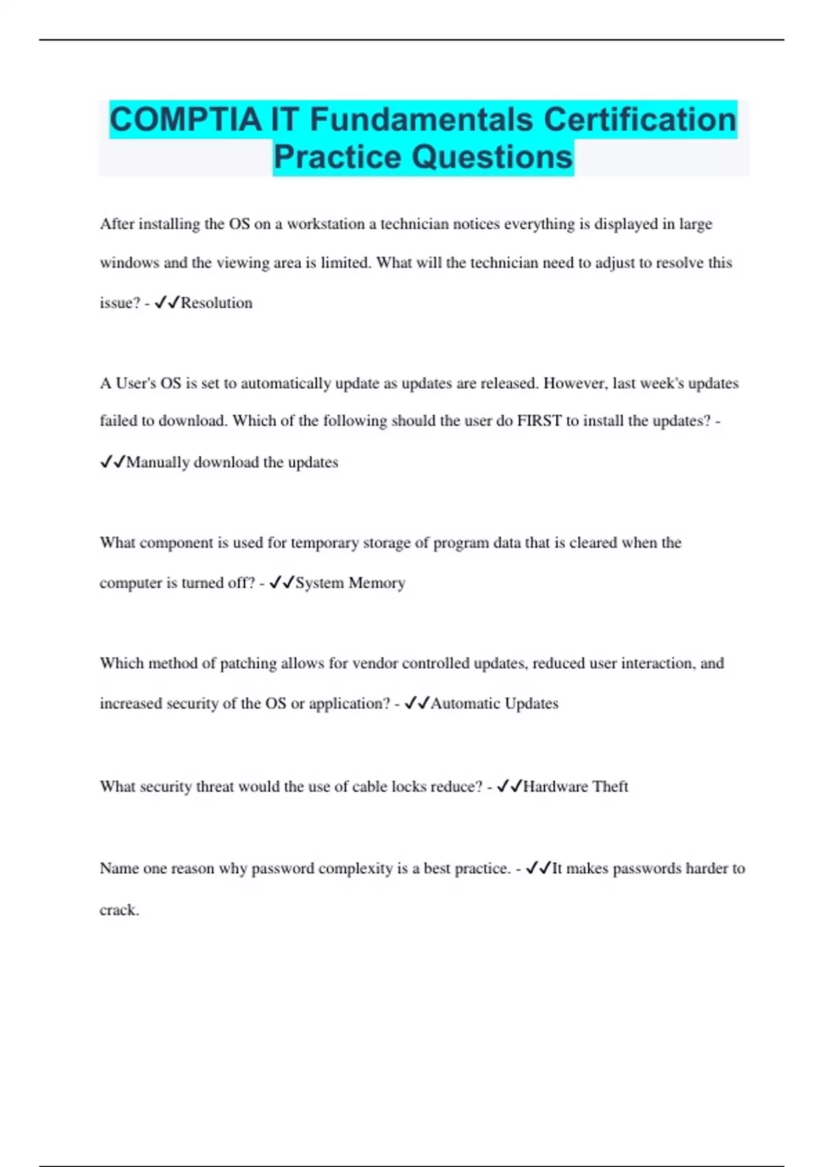 After installing the OS on a workstation a technician notices everything is displayed in large windows and the viewing area is limited. What will the technician need to adjust to resolve this issue? - Resolution A User's OS is set to automatically update as updates are released. However, last week's updates failed to download. Which of the following should the user do FIRST to install the updates? - Manually download the updates What component is used for temporary storage of program data that is cleared when the computer is turned off? - System Memory Which method of patching allows for vendor controlled updates, reduced user interaction, and increased security of the OS or application? - Automatic Updates What security threat would the use of cable locks reduce? - Hardware Theft Name one reason why password complexity is a best practice. - It makes passwords harder to crack