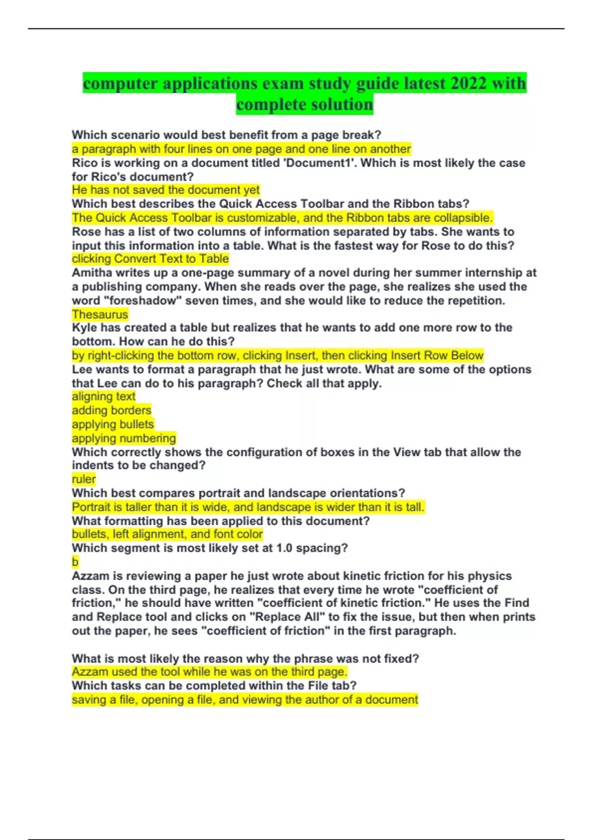 computer applications exam study guide latest 2022 with complete solution Which scenario would best benefit from a page break? a paragraph with four lines on one page and one line on another Rico is working on a document titled 'Document1'. Which is most likely the case for Rico's document? He has not saved the document yet Which best describes the Quick Access Toolbar and the Ribbon tabs? The Quick Access Toolbar is customizable, and the Ribbon tabs are collapsible. Rose has a list of two columns of information separated by tabs. She wants to input this information into a table. What is the fastest way for Rose to do this? clicking Convert Text to Table Amitha writes up a one-page summary of a novel during her summer internship at a publishing company. When she reads over the page, she realizes she used the word "foreshadow" seven times, and she would like to reduce the repetition. Thesaurus Kyle has created a table but realizes that he wants to add one more row to the bottom. How can he do this? by right-clicking the bottom row, clicking Insert, then clicking Insert Row Below Lee wants to format a paragraph that he just wrote. What are some of the options that Lee can do to his paragraph? Check all that apply. aligning text adding borders applying bullets applying numbering Which correctly shows the configuration of boxes in the View tab that allow the indents to be changed? ruler Which best compares portrait and landscape orientations? Portrait is taller than it is wide, and landscape is wider than it is tall. What formatting has been applied to this document? bullets, left alignment, and font color Which segment is most likely set at 1.0 spacing? b Azzam is reviewing a paper he just wrote about kinetic friction for his physics class. On the third page, he realizes that every time he wrote "coefficient of friction," he should have written "coefficient of kinetic friction." He uses the Find and Replace tool and clicks on "Replace All" to fix the issue, but then when prints out the paper, he sees "coefficient of friction" in the first paragraph. What is most likely the reason why the phrase was not fixed? Azzam used the tool while he was on the third page. Which tasks can be completed within the File tab? saving a file, opening a file, and viewing the author of a document Which steps will create a new blank Word document? Click File, click New, then double-click Blank document. How do you change a Word document to an .html file? Save it as a Web page The AutoRecovery feature would be useful for which situations? Check all that apply. You closed a file without saving it then realized that you do need the file. You were working on a file when Word quit unexpectedly. Which steps will open the Help system so that you can enter a question and do a search for help? Click the File tab, click Help, then click Microsoft Office Help. Lee only wants to print columns A-D of a spreadsheet he is working on. What sequence should he use to accomplish this? select A-D with his mouse, File, Print, Print Active sheets, Print Selection, Print Haan creates this table to track his income. Which would give him the total income for the year? =SUM(B2:B13) Stacey wants to change her document to landscape view instead of portrait. Jesse wants to change the scale of his document. Which best describes all of the options that Stacey and Jesse each have? Stacey and Jesse can both look under Page Layout or under File and select Print. This spreadsheet shows an invoice for hours worked. If a user copies the formula from D15 into D16, what would the formula read in D16? =B16*C16 Garrett has a column of data. What can he do at the bottom of that column of data using an Auto function? Check all that apply. SUM AVERAGE MIN MAX COUNT Wendy wants to format the cells of a spreadsheet but not the text. Which formatting tools should Wendy use? Check all that apply. row height row width border Uri would like to change the font color in a group of cells. In which part of the Excel window should he look for font color controls? the ribbon Fran is changing the font, background color, and size of some text in a cell. She also makes it bold and italicized. She then leaves a comment in a cell. Which are all examples of Fran using text formatting? font, size, bold, italicize Anandi has been working with Excel to record data from an extensive physics experiment at her university. She has hundreds of columns representing different trials, and many rows showing different pieces of data from each trial. A handful of cells have data that stand out, so she needs to show them to her professor, even though these cells are hundreds of columns apart. If Anandi has written down the names of those cells, what is the fastest way to get to these cells while in Excel? pressing Control + G and typing in the address of each needed cell This table lists family members and their ages. What must have been selected to yield this new table? shift cells up One easy way to tell if a cell contains a formula instead of data is to click on the cell and look at the formula bar to see if it begins with an equal sign. Mr. Prasad is a high school English teacher. He weighs different essays and assignments differently while calculating final grades. Therefore, he has made an Excel worksheet showing how different classwork weighs into a final grade. He would like to distribute an electronic file to his students, but he wants everyone to be able to read it regardless of whether or not they have Microsoft Office Suite. What can Mr. Prasad do to best distribute the file? use "Save As" to save it as an Adobe PDF file Even though there are aspects of a PowerPoint presentation that are not printable, usually basic art, text, and images are printable. The Print command in PowerPoint is found in the File tab. Fryshta is using the Help window in PowerPoint to learn about inserting Smart Shapes into a presentation. She currently has a Help page open that shows all of the steps 