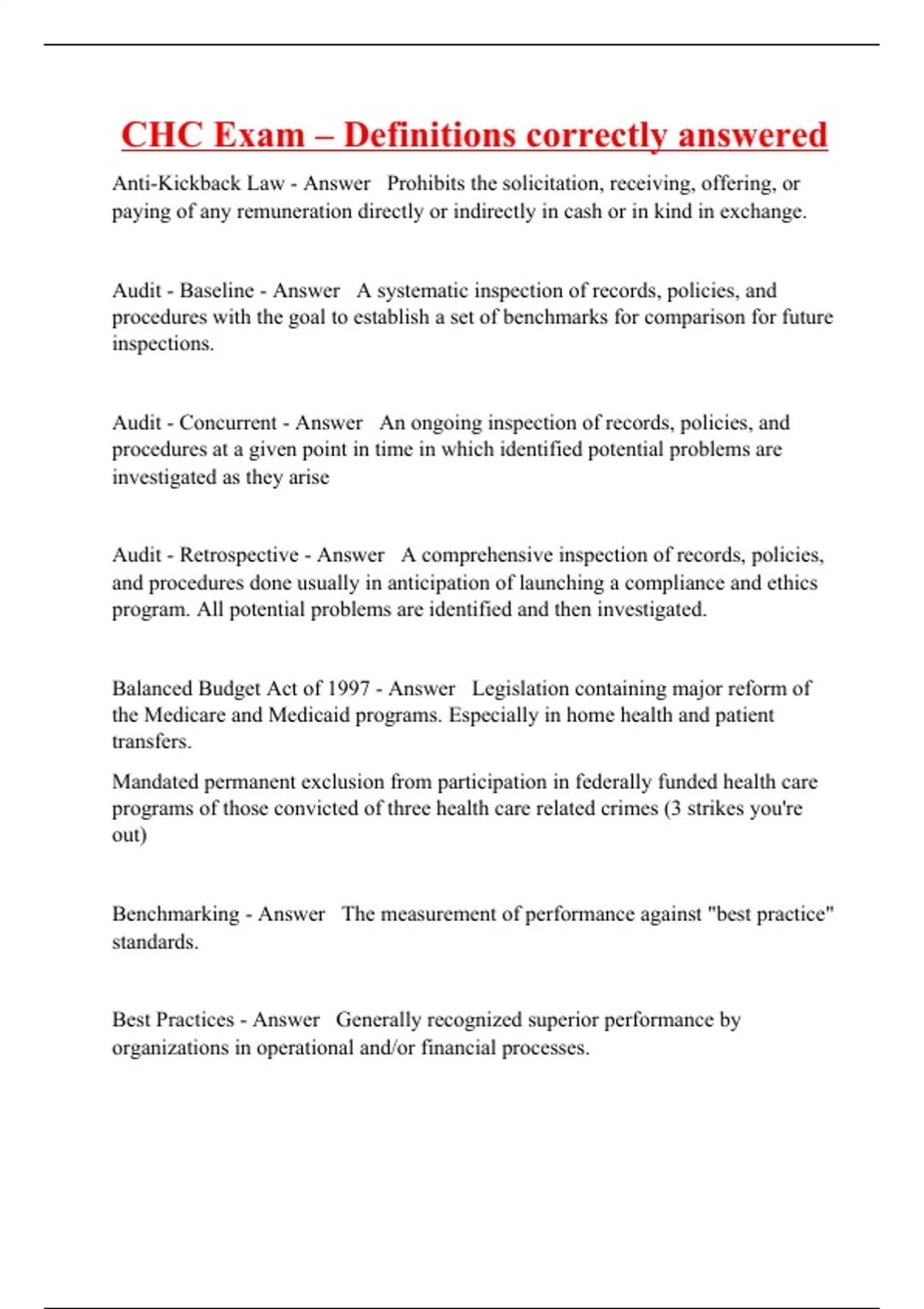 Anti-Kickback Law - Answer Prohibits the solicitation, receiving, offering, or paying of any remuneration directly or indirectly in cash or in kind in exchange. Audit - Baseline - Answer A systematic inspection of records, policies, and procedures with the goal to establish a set of benchmarks for comparison for future inspections. Audit - Concurrent - Answer An ongoing inspection of records, policies, and procedures at a given point in time in which identified potential problems are investigated as they arise Audit - Retrospective - Answer A comprehensive inspection of records, policies, and procedures done usually in anticipation of launching a compliance and ethics program. All potential problems are identified and then investigated. Balanced Budget Act of 1997 - Answer Legislation containing major reform of the Medicare and Medicaid programs. Especially in home health and patient transfers. Mandated permanent exclusion from participation in federally funded health care programs of those convicted of three health care related crimes (3 strikes you're out) Benchmarking - Answer The measurement of performance against "best practice" standards. Best Practices - Answer Generally recognized superior performance by organizations in operational and/or financial processes.
