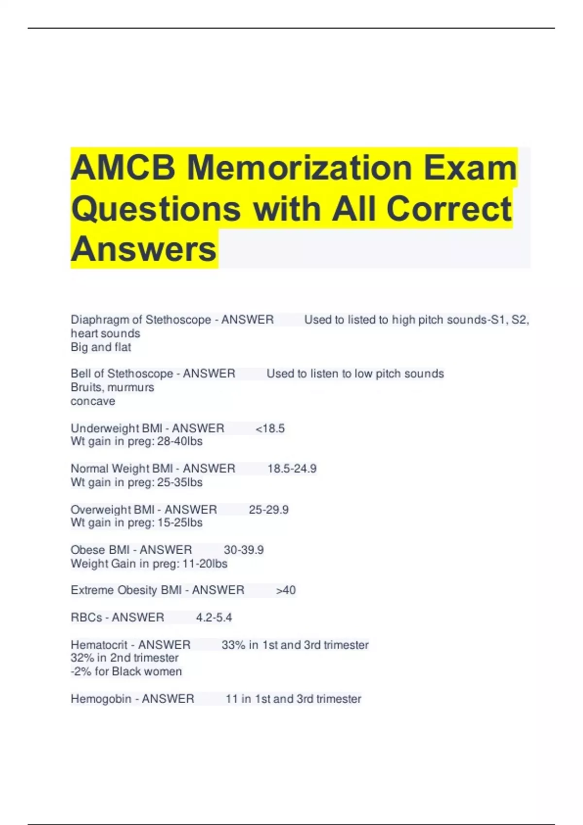 AMCB Memorization Exam Questions with All Correct Answers Diaphragm of Stethoscope - ANSWER Used to listed to high pitch sounds-S1, S2, heart sounds Big and flat Bell of Stethoscope - ANSWER Used to listen to low pitch sounds Bruits, murmurs concave Underweight BMI - ANSWER <18.5 Wt gain in preg: 28-40lbs Normal Weight BMI - ANSWER 18.5-24.9 Wt gain in preg: 25-35lbs Overweight BMI - ANSWER 25-29.9 Wt gain in preg: 15-25lbs Obese BMI - ANSWER 30-39.9 Weight Gain in preg: 11-20lbs Extreme Obesity BMI - ANSWER >40 RBCs - ANSWER 4.2-5.4 Hematocrit - ANSWER 33% in 1st and 3rd trimester 32% in 2nd trimester -2% for Black women Hemogobin - ANSWER 11 in 1st and 3rd trimester 10.5 in 2nd -0.8 for Black Women