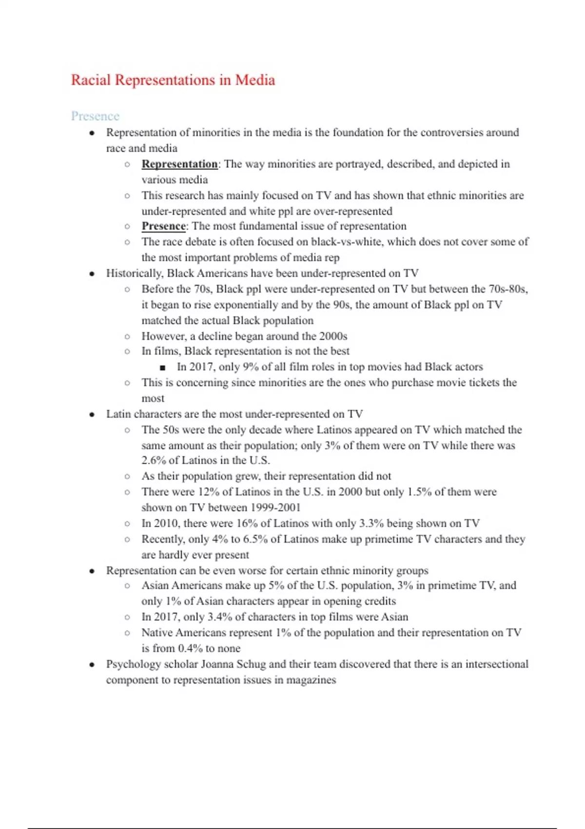 This set of notes come from the school year from Media, Culture, and Society. This includes statistics and effects of racial representation within the media and even the newsroom.