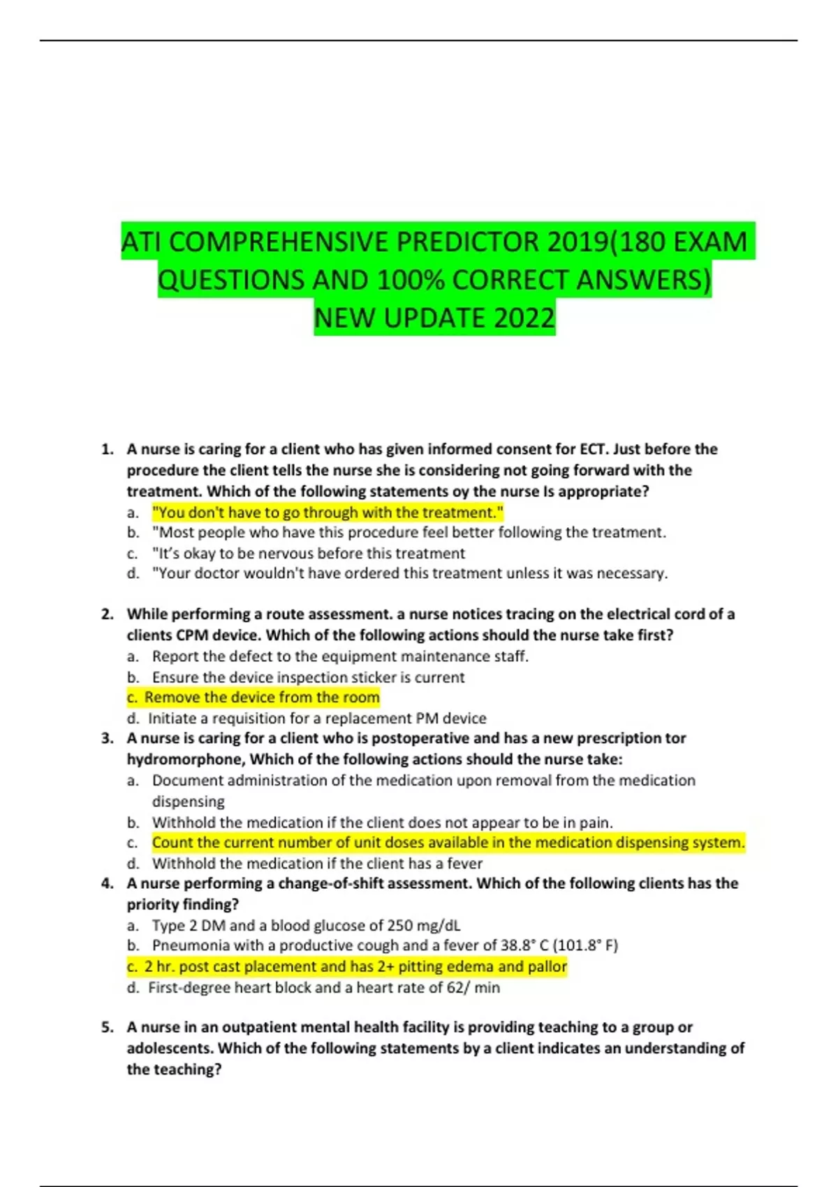 ATI COMPREHENSIVE PREDICTOR 2019(180 EXAM QUESTIONS AND 100% CORRECT ANSWERS) NEW UPDATE 2022