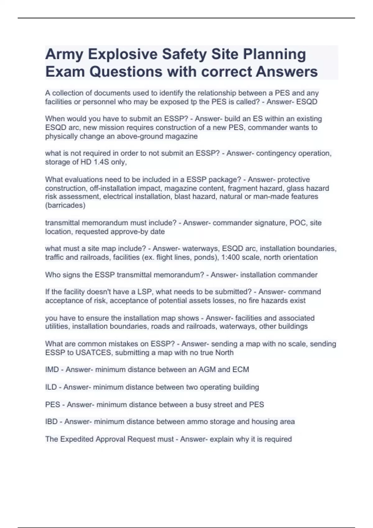 A collection of documents used to identify the relationship between a PES and any facilities or personnel who may be exposed tp the PES is called? - Answer- ESQD When would you have to submit an ESSP? - Answer- build an ES within an existing ESQD arc, new mission requires construction of a new PES, commander wants to physically change an above-ground magazine what is not required in order to not submit an ESSP? - Answer- contingency operation, storage of HD 1.4S only, What evaluations need to be included in a ESSP package? - Answer- protective construction, off-installation impact, magazine content, fragment hazard, glass hazard risk assessment, electrical installation, blast hazard, natural or man-made features (barricades) transmittal memorandum must include? - Answer- commander signature, POC, site location, requested approve-by date what must a site map include? - Answer- waterways, ESQD arc, installation boundaries, traffic and railroads, facilities (ex. flight lines, ponds), 1:400 scale, north orientation Who signs the ESSP transmittal memorandum? - Answer- installation commander If the facility doesn't have a LSP, what needs to be submitted? - Answer- command acceptance of risk, acceptance of potential assets losses, no fire hazards exist you have to ensure the installation map shows - Answer- facilities and associated utilities, installation boundaries, roads and railroads, waterways, other buildings What are common mistakes on ESSP? - Answer- sending a map with no scale, sending ESSP to USATCES, submitting a map with no true North IMD - Answer- minimum distance between an AGM and ECM ILD - Answer- minimum distance between two operating building PES - Answer- minimum distance between a busy street and PES IBD - Answer- minimum distance between ammo storage and housing area The Expedited Approval Request must - Answer-