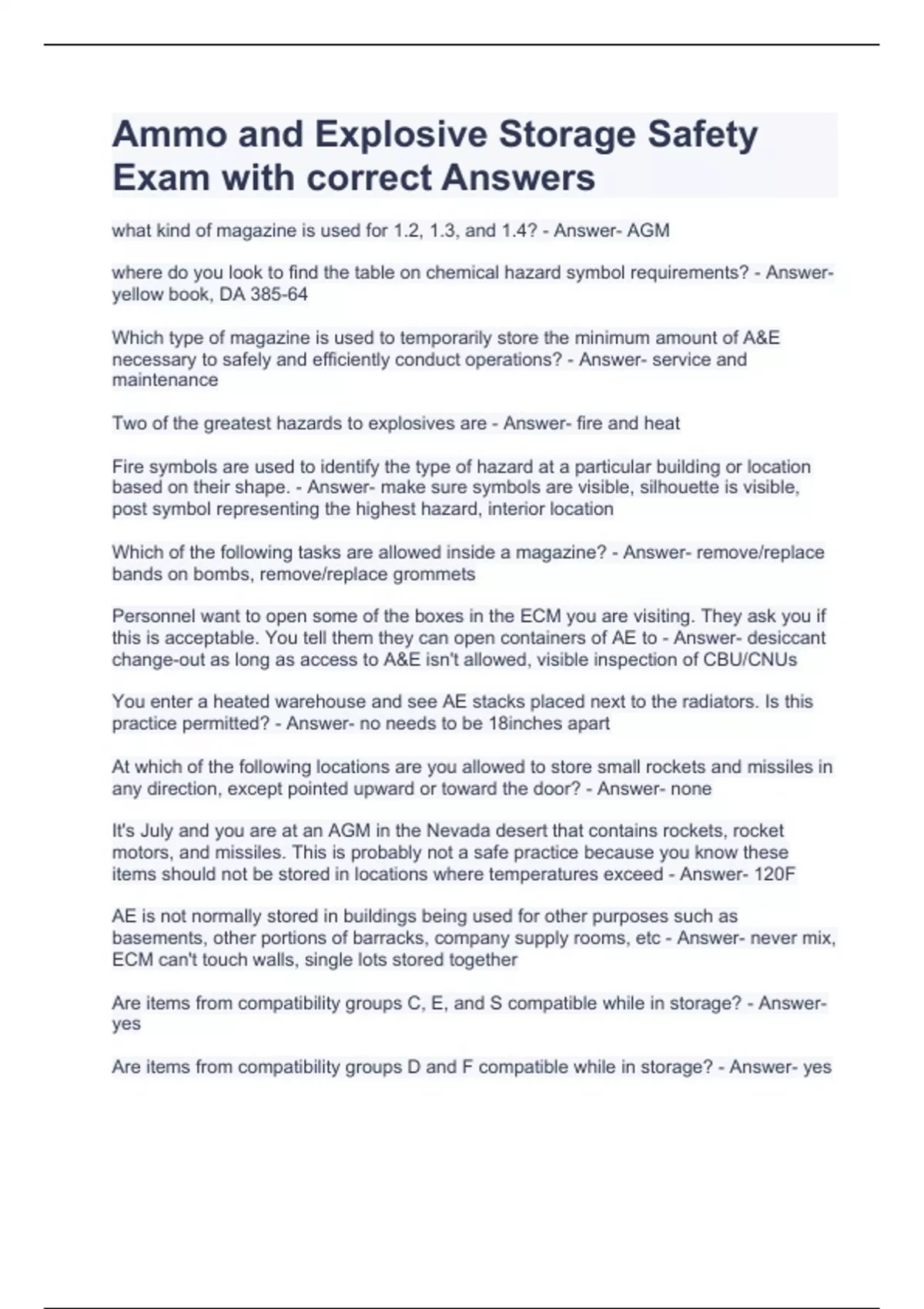 what kind of magazine is used for 1.2, 1.3, and 1.4? - Answer- AGM where do you look to find the table on chemical hazard symbol requirements? - Answer- yellow book, DA 385-64 Which type of magazine is used to temporarily store the minimum amount of A&E necessary to safely and efficiently conduct operations? - Answer- service and maintenance Two of the greatest hazards to explosives are - Answer- fire and heat Fire symbols are used to identify the type of hazard at a particular building or location based on their shape. - Answer- make sure symbols are visible, silhouette is visible, post symbol representing the highest hazard, interior location Which of the following tasks are allowed inside a magazine? - Answer- remove/replace bands on bombs, remove/replace grommets Personnel want to open some of the boxes in the ECM you are visiting. They ask you if this is acceptable. You tell them they can open containers of AE to - Answer- desiccant change-out as long as access to A&E isn't allowed, visible inspection of CBU/CNUs You enter a heated warehouse and see AE stacks placed next to the radiators. Is this practice permitted? - Answer- no needs to be 18inches apart At which of the following locations are you allowed to store small rockets and missiles in any direction, except pointed upward or toward the door? - Answer- none It's July and you are at an AGM in the Nevada desert that contains rockets, rocket motors, and missiles. This is probably not a safe practice because you know these items should not be stored in locations where temperatures exceed - Answer- 120F AE is not normally stored in buildings being used for other purposes such as basements, other portions of barracks, company supply rooms, etc - Answer- never mix, ECM can't touch walls, single lots stored together Are items from compatibility groups C, E, and S compatible while in storage? - Answer- yes Are items from compatibility groups D and F compatible while in storage? - Answer- yes Battery, gasoline, or diesel-powered MHE can be stored in magazines and other suitable areas designed for that purpose. The areas must be empty or only contain inert materials. What other requirements apply? - Answer- 10 ft apart, spaced to minimize fire, aisle kept clear Which of the following statements regarding temporary storage of battery-powered MHE inside a magazine with AE is true? - Answer- Not stored over four days, if not used. Inspected after each workday. Shut down but battery cables cannot be disconnected. Parked and secured at the maximum distance allowed from A&E. Never stored in operating buildings containing exposed explosives. You notice an MHE item that was last inspected seven months ago. How often must MHE pass a load test to make sure it is capable of handling its intended load? - Answer- yearly To operate MHE inside a magazine containing ammunition and explosives, all of these stipulations must be met EXCEPT - Answer- the Operator must be a QASAS or Ammo Manager. You are reviewing this planograph information before a site visit to the magazine. What is the explosive weight limit for this magazine? - Answer- 500,000 During your visit to the magazine you see an issue with the materiel in area A of this partial planograph. How would you describe the coordinates of area "A" in your report? - Answer- BDCE You are reviewing this planograph information before a site visit to the magazine. What is the total amount of explosives contained in this magazine? - Answer- 456, 658lbs What are some general safety requirements for Government vehicles used to transport hazardous materials? - Answer- engine off, block and brace after loading, verified with AMC drawing Motor vehicles that will carry which of the following hazard classes/divisions must first be inspected using DD Form 626? - Answer- 1.2, 1.3, 1.4 DOT requires placards be p