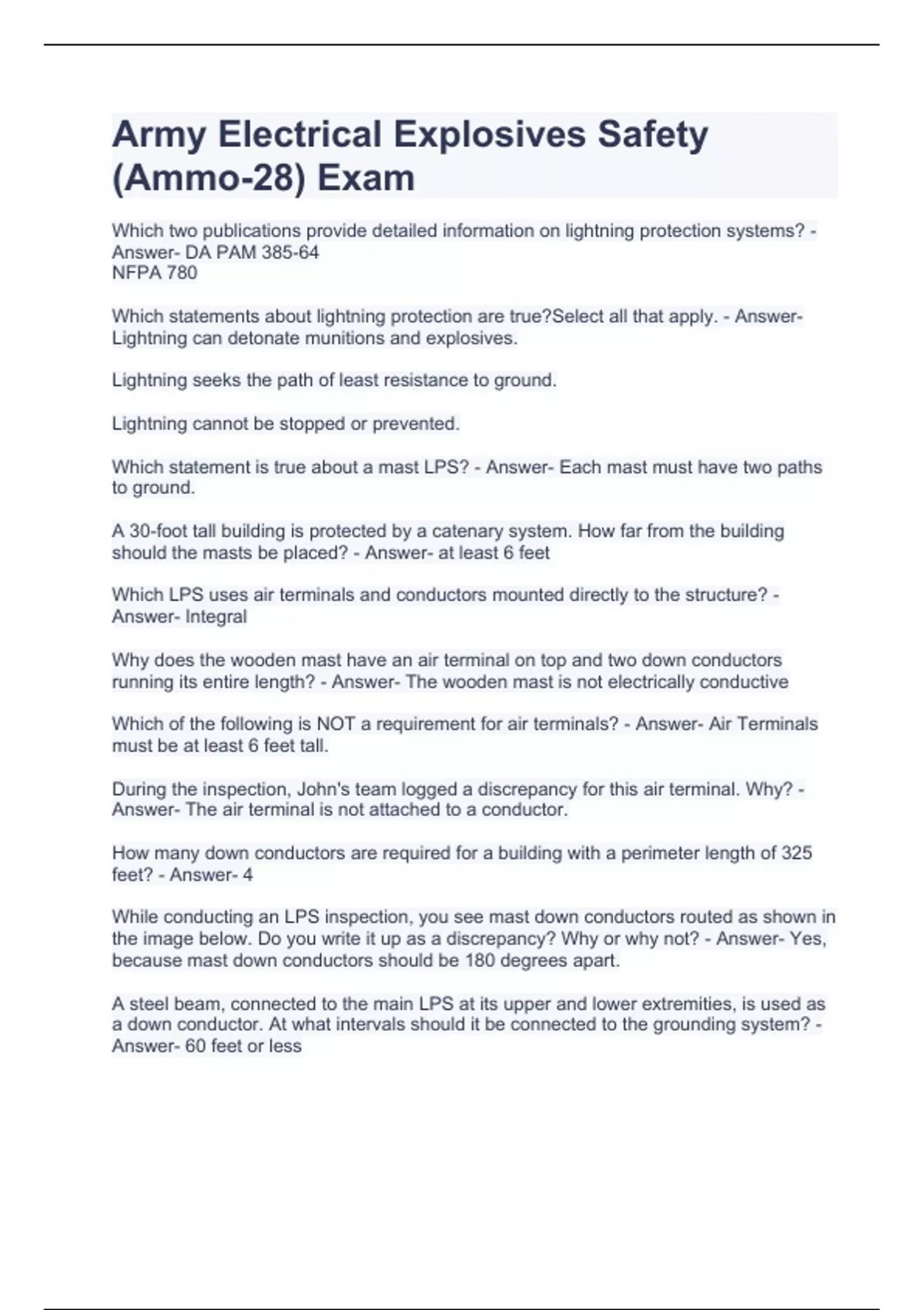 Which two publications provide detailed information on lightning protection systems? - Answer- DA PAM 385-64 NFPA 780 Which statements about lightning protection are true?Select all that apply. - Answer- Lightning can detonate munitions and explosives. Lightning seeks the path of least resistance to ground. Lightning cannot be stopped or prevented. Which statement is true about a mast LPS? - Answer- Each mast must have two paths to ground. A 30-foot tall building is protected by a catenary system. How far from the building should the masts be placed? - Answer- at least 6 feet Which LPS uses air terminals and conductors mounted directly to the structure? - Answer- Integral Why does the wooden mast have an air terminal on top and two down conductors running its entire length? - Answer- The wooden mast is not electrically conductive Which of the following is NOT a requirement for air terminals? - Answer- Air Terminals must be at least 6 feet tall. During the inspection, John's team logged a discrepancy for this air terminal. Why? - Answer- The air terminal is not attached to a conductor. How many down conductors are required for a building with a perimeter length of 325 feet? - Answer- 4 While conducting an LPS inspection, you see mast down conductors routed as shown in the image below. Do you write it up as a discrepancy? Why or why not? - Answer- Yes, because mast down conductors should be 180 degrees apart. A steel beam, connected to the main LPS at its upper and lower extremities, is used as a down conductor. At what intervals should it be connected to the grounding system? - Answer- 60 feet or less Which statement about grounding systems is true? - Answer- The resistance should be 25 ohms or less. Which of the following statements regarding bonding are true? Select all that apply. - Answer- Bonding reduces the threat of sideflash by providing a low impedance path to ground. Bonding is a way of connecting LPS conductors to grounded metal objects. When should a grounded metal object be considered for bonding? - Answer- When it's within 6 feet of a conductor Which bonding method is the most permanent and secure? - Answer- Exothermic weld Which factors are used to calculate bonding distance?Select all that apply. - Answer- Height of proposed bond Flashover medium Number of down conductors While conducting the inspection, John's team noticed a new metal light pole installed 3 feet from the down conductor at the corner of this building. They logged a discrepancy. Why? - Answer- Because grounded metal objects within 6 feet of LPS conductors should be bonded to it Which types of information does an LPS record provide? Select all that apply. - Answer- Test locations Test item descriptions or listing Type of test Responsibilities for conducting and administering the test plan Which section of DA PAM 385-64 provides LPS visual inspection guidance? - Answer- Appendix D How often is a visual inspection required on an LPS? - Answer- Every 12 months While conducting the LPS inspection, the team saw these surveillance cameras. Does this building comply with LPS standards? - Answer- No, because the surveillance cameras are outside the zone of protection. How long must LPS test results be kept on file? - Answer- 6 inspection cycles How often is a conductive floor electrical test