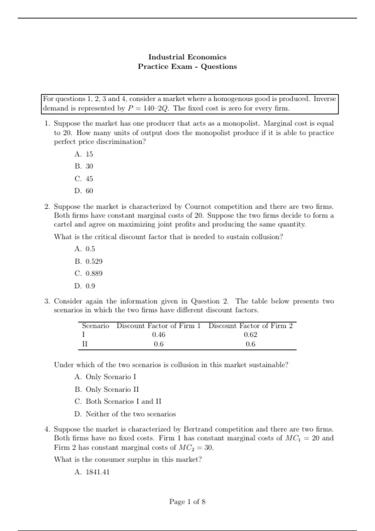 7. A market consists of eight firms that compete by setting quantities. For each firm, the