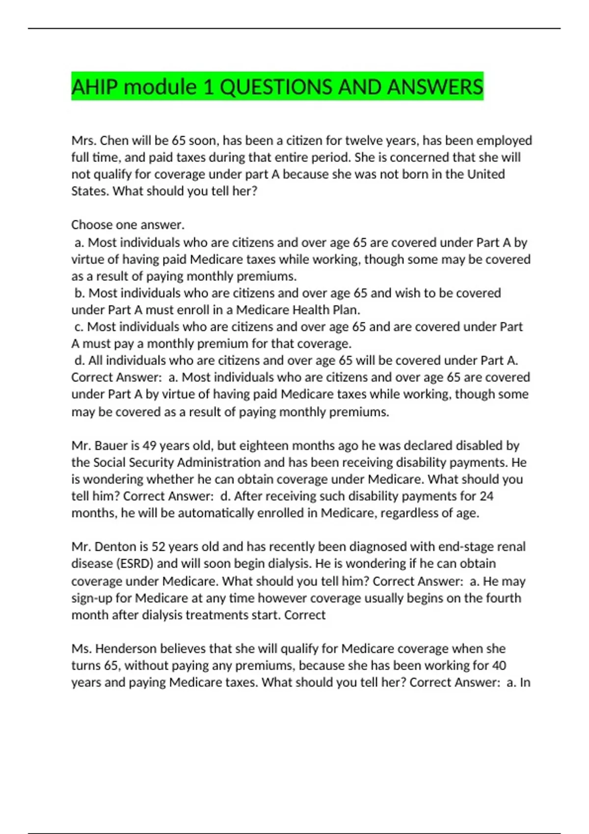 Mrs. Chen will be 65 soon, has been a citizen for twelve years, has been employed full time, and paid taxes during that entire period. She is concerned that she will not qualify for coverage under part A because she was not born in the United States. What should you tell her? Choose one answer. a. Most individuals who are citizens and over age 65 are covered under Part A by virtue of having paid Medicare taxes while working, though some may be covered as a result of paying monthly premiums. b. Most individuals who are citizens and over age 65 and wish to be covered under Part A must enroll in a Medicare Health Plan. c. Most individuals who are citizens and over age 65 and are covered under Part A must pay a monthly premium for that coverage.