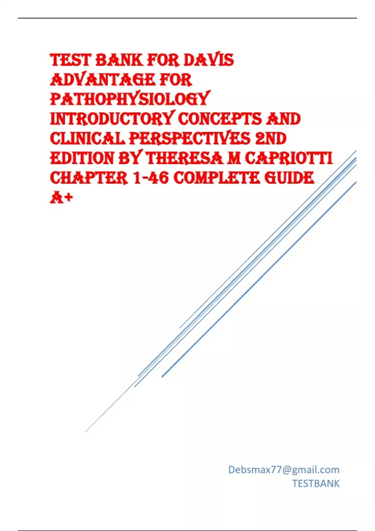 Test Bank for Davis Advantage for Pathophysiology Introductory Concepts and Clinical Perspectives 2nd Edition By Theresa M Capriotti Chapter 1-46 Complete Guide A+ 4118, 3 1470, 1 1: The Cell in Health and Illness 2: Cellular Injury, Adaptations, and Maladaptive Changes 3: Genetic Basis of Disease 4: Stress, Exercise, and Immobility 5: Obesity and Nutritional Imbalances 6: Pain 7: Fluid and Electrolyte Imbalances 8: Acid-Base Imbalances 9: Inflammation and Dysfunctional Wound Healing 10: Infectious Diseases 11: Disorders of the Immune System 12: Disorders of White Blood Cells 13: Disorders of Red Blood Cells 14: Disorders of Platelets, Hemostasis, and Coagulation 15: Arterial Disorders 16: Ischemic Heart Disease and Conduction Disorders 17: Heart Failure 18: Valvular Heart Disease 19: Disorders of the Venous System 20: Respiratory Inflammation and Infection 21: Restrictive and Obstructive Pulmonary Disorders 22: Renal Disorders 23: Urological Disorders 24: Endocrine Disorders 25: Diabetes Mellitus and the Metabolic Syndrome 26: Disorders of the Female Reproductive System 27: Disorders of the Male Reproductive System 28: Sexually Transmitted Infections 29: Disorders of the Esophagus, Stomach, and Small Intestine 30: Common Disorders of the Large Intestine 31: Infection, Inflammation, and Cirrhosis of the Liver 32: Gallbladder, Pancreatic, and Bile Duct Dysfunction 33: Cerebrovascular Disorders 34: Chronic and Degenerative Neurological Disorders 35: Brain and Spinal Cord Injury 36: Psychobiology of Behavioral Disorders 37: Musculoskeletal Trauma 38: Degenerative Disorders of the Musculoskeletal System 39: Infection and Inflammatory Disorders of the Musculoskeletal System 40: Cancer 41: Skin Disorders 42: Burns 43: Eye Disorders 44: Ear Disorders 45: Pathophysiological Concepts of Aging 46: SIRS, Sepsis, Shock, MODS, and Death