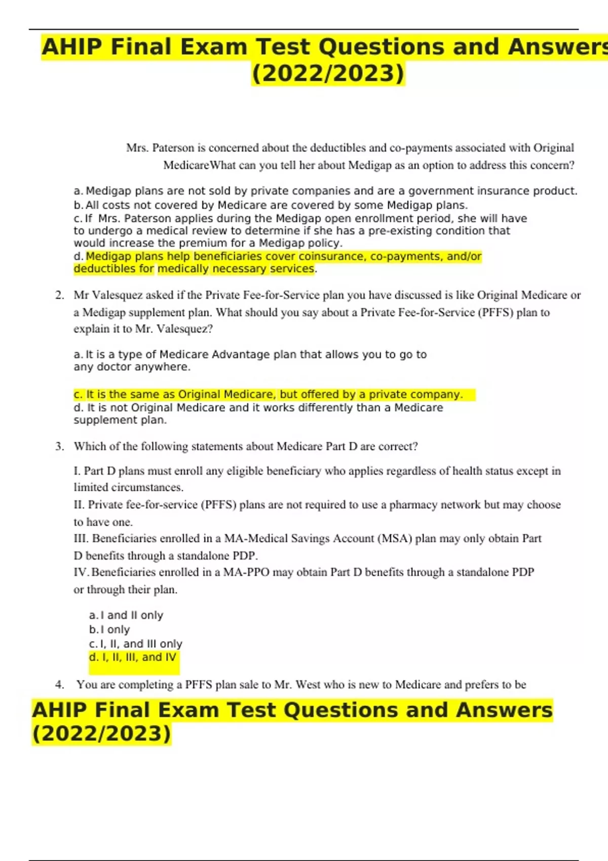 Mrs. Paterson is concerned about the deductibles and co-payments associated with Original MedicareWhat can you tell her about Medigap as an option to address this concern? a. Medigap plans are not sold by private companies and are a government insurance product. b. All costs not covered by Medicare are covered by some Medigap plans. c. If Mrs. Paterson applies during the Medigap open enrollment period, she will have to undergo a medical review to determine if she has a pre-existing condition that would increase the premium for a Medigap policy. d. Medigap plans help beneficiaries cover coinsurance, co-payments, and/or deductibles for medically necessary services. 2. Mr Valesquez asked if the Private Fee-for-Service plan you have discussed is like Original Medicare or a Medigap supplement plan. What should you say about a Private Fee-for-Service (PFFS) plan to explain it to Mr. Valesquez? a. It is a type of Medicare Advantage plan that allows you to go to any doctor anywhere. c. It is the same as Original Medicare, but offered by a private company. d. It is not Original Medicare and it works differently than a Medicare supplement plan. 3. Which of the following statements about Medicare Part D are correct? I. Part D plans must enroll any eligible beneficiary who applies regardless of health status except in limited circumstances. II. Private fee-for-service (PFFS) plans are not required to use a pharmacy network but may choose to have one. III. Beneficiaries enrolled in a MA-Medical Savings Account (MSA) plan may only obtain Part D benefits through a standalone PDP. IV. Beneficiaries enrolled in a MA-PPO may obtain Part D benefits through a standalone PDP or through their plan. a. I and II only b. I only c. I, II, and III onl