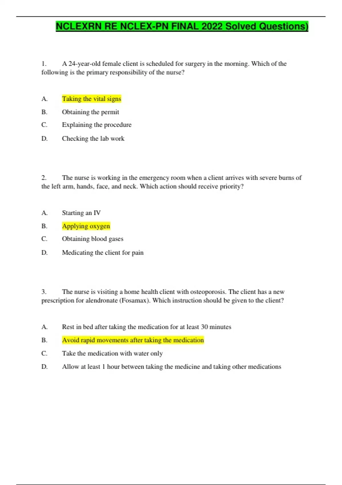 Nclex rn re nclex pn final 2022 1. A 24-year-old female client is scheduled for surgery in the morning. Which of the following is the primary responsibility of the nurse? A. Taking the vital signs B. Obtaining the permit C. Explaining the procedure D. Checking the lab work 2. The nurse is working in the emergency room when a client arrives with severe burns of the left arm, hands, face, and neck. Which action should receive priority? A. Starting an IV B. Applying oxygen C. Obtaining blood gases D. Medicating the client for pain 3. The nurse is visiting a home health client with osteoporosis. The client has a new prescription for alendronate (Fosamax). Which instruction should be given to the client? A. Rest in bed after taking the medication for at least 30 minutes B. Avoid rapid movements after taking the medication C. Take the medication with water only D. Allow at least 1 hour between taking the medicine and taking other medications NCLEXRN RE NCLEX-PN FINAL 2022 Solved Questions) 4. The nurse is making initial rounds on a client with a C5 fracture and crutchfield tongs. Which equipment should be kept at the bedside? A. A pair of forceps B. A torque wrench C. A pair of wire cutters D. A screwdriver 5. An infant weighs 7 pounds at birth. The expected weight by 1 year should be: A. 10 pounds B. 12 pounds C. 18 pounds D. 21 pounds 6. A client is admitted with a Ewing’s sarcoma. Which symptoms would be expected due to this tumor’s location? A. Hemiplegia B. Aphasia C. Nausea D. Bone pain 7. The nurse is caring for a client with epilepsy who is being treated with carbamazepine (Tegretol). Which laboratory value might indicate a serious side effect of this drug? A. Uric acid of 5mg/dL NCLEXRN RE NCLEX-PN FINAL 2022 Solved Questions) B. Hematocrit of 33% C. WBC 2,000 per cubic millimeter D. Platelets 150,000 per cubic millimeter 8. A 6-month-old client is admitted with possible intussuception. Which question during the nursing history is least helpful in obtaining information regarding this diagnosis? A. “Tell me about his pain.” B. “What does his vomit look like?” C. “Describe his usual diet.” D. “Have you noticed changes in his abdominal size?” 9. The nurse is assisting a client with diverticulosis to select appropriate foods. Which food should be avoided? A. Bran B. Fresh peaches C. Cucumber salad D. Yeast rolls 10. A client has rectal cancer and is scheduled for an abdominal perineal resection. What should be the priority nursing care during the post-op period? A. Teaching how to irrigate the illeostomy B. Stopping electrolyte loss in the incisional area C. Encouraging a high-fiber diet D. Facilitating perineal wound drainage NCLEXRN RE NCLEX-PN FINAL 2022 Solved Questions) 11. The nurse is performing discharge teaching on a client with diverticulitis who has been placed on a low-roughage diet. Which food would have to be eliminated from this client’s diet? A. Roasted chicken B. Noodles C. Cooked broccoli D. Custard 12. A client arrives in the emergency room with a possible fractured femur. The nurse should anticipate an order for: A. Trendelenburg position B. Ice to the entire extremity C. Buck’s traction D. An abduction pillow 13. A client with cancer is to undergo an intravenous pyelogram. The nurse should: A. Force fluids 24 hours before the procedure B. Ask the client to void immediately before the study C. Hold medication that affects the central nervous system for 12 hours pre- and post-test D. Cover the client’s reproductive organs with an x-ray shield 14. The nurse is caring for a client with a malignancy. The classification of the primary tumor is Tis. The nurse should plan care for a tumor: A. That cannot be assessed B. That is in situ NCLEXRN RE NCLEX-PN FINAL 2022 Solved Questions) C. With increasing lymph node involvement D. With distant metastasis 15. A client is 2 days post-operative colon resection. After a coughing episode, the client’s wound eviscerates. Which nursing action is most appropriate? A. Reinsert the protruding organ and cover with 4×4s B. Cover the wound with a sterile 4×4 and ABD dressing C. Cover the wound with a sterile saline-soaked dressing D. Apply an abdominal binder and manual pressure to the wound 16. The nurse is preparing a client for surgery. Which item is most important to remove before sending the client to surgery? A. Hearing aid B. Contact lenses C. Wedding ring D. Artificial eye 17. The nurse on the 3–11 shift is assessing the chart of a client with an abdominal aneurysm scheduled for surgery in the morning and finds that the consent form has been signed, but the client is unclear about the surgery and possible complications. Which is the most appropriate action? A. Call the surgeon and ask him or her to see the client to clarify the information B. Explain the procedure and complications to the client C. Check in the physician’s progress notes to see if understanding has been documented D. Check with the client’s family to see if they understand the procedure fully NCLEXRN RE NCLEX-PN FINAL 2022 Solved Questions) 18. The client with diabetes is preparing for discharge. During discharge teaching, the nurse assesses the client’s ability to care for himself. Which statement made by the client would indicate a need for follow-up after discharge? A. “I live by myself.” B. “I have trouble seeing.” C. “I have a cat in the house with me.” D. “I usually drive myself to the doctor.” 19. The client is receiving total parenteral nutrition (TPN). Which lab test should be evaluated while the client is receiving TPN? A. Hemoglobin B. Creatinine C. Blood glucose D. White blood cell count 20. The client with a myocardial infarction comes to the nurse’s station stating that he is ready to go home because there is nothing wrong with him. Which defense mechanism is the client using? A. Rationalization B. Denial C. Projection D. Conversion reaction NCLEXRN RE NCLEX-PN FINAL 2022 Solved Questions) 21. Which